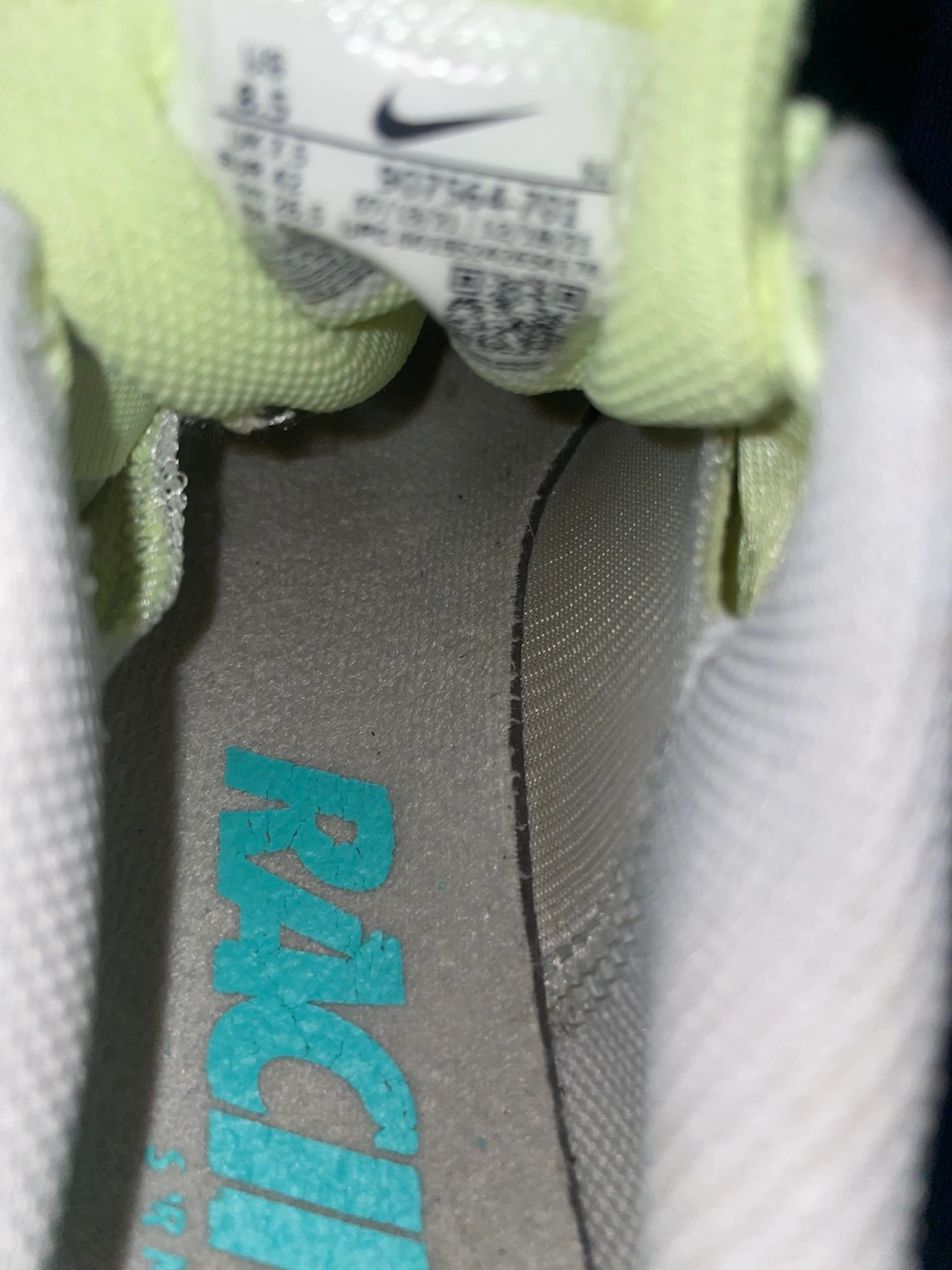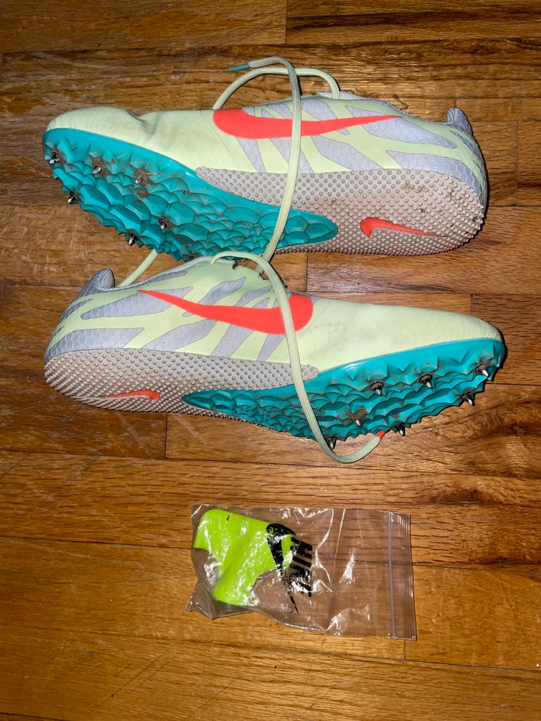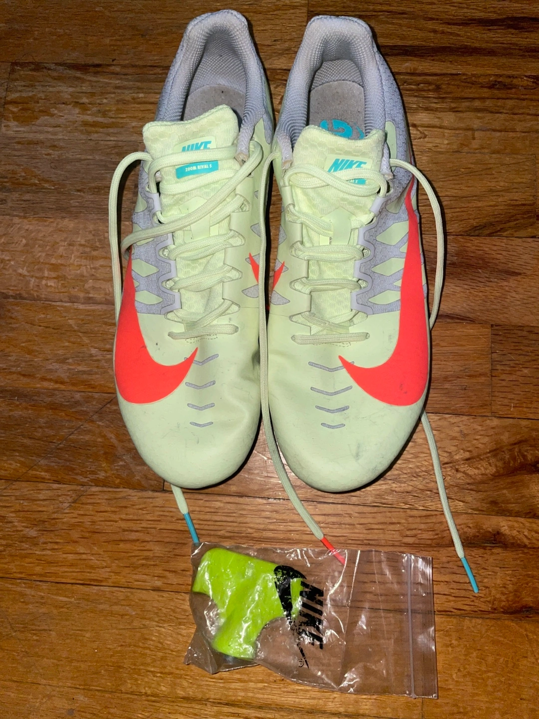 Pair of used Nike track spikes. Light green colorway with orange accents. Includes spike wrench. Some wear and tear.