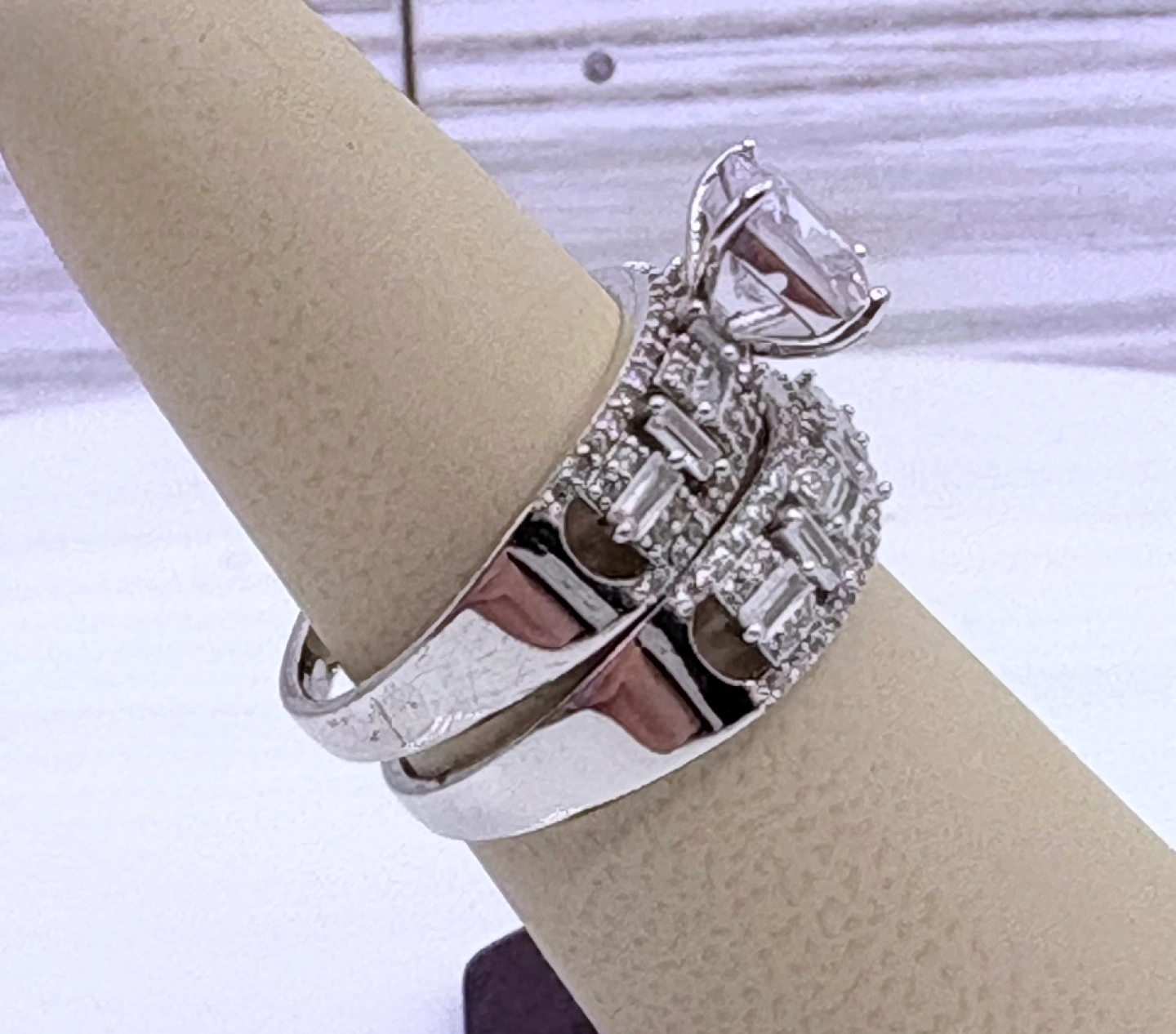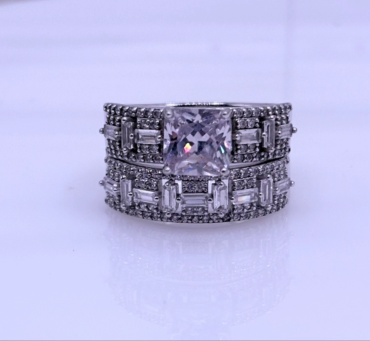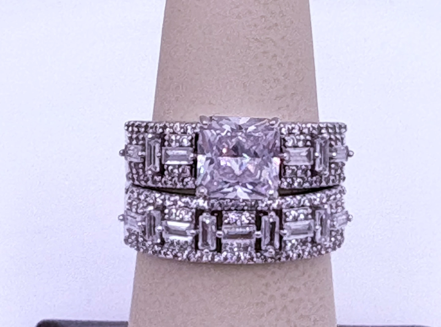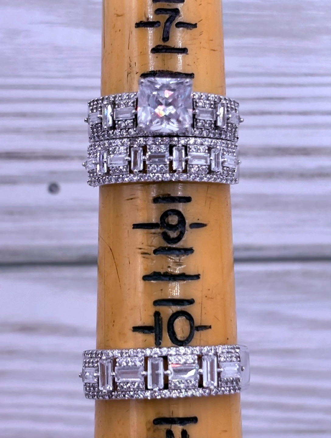 Beautiful trio-bridal ring set. Features baguette and princess-cut cubic zirconia stones. Elegant and sparkly. Perfect for a wedding or special occasion.