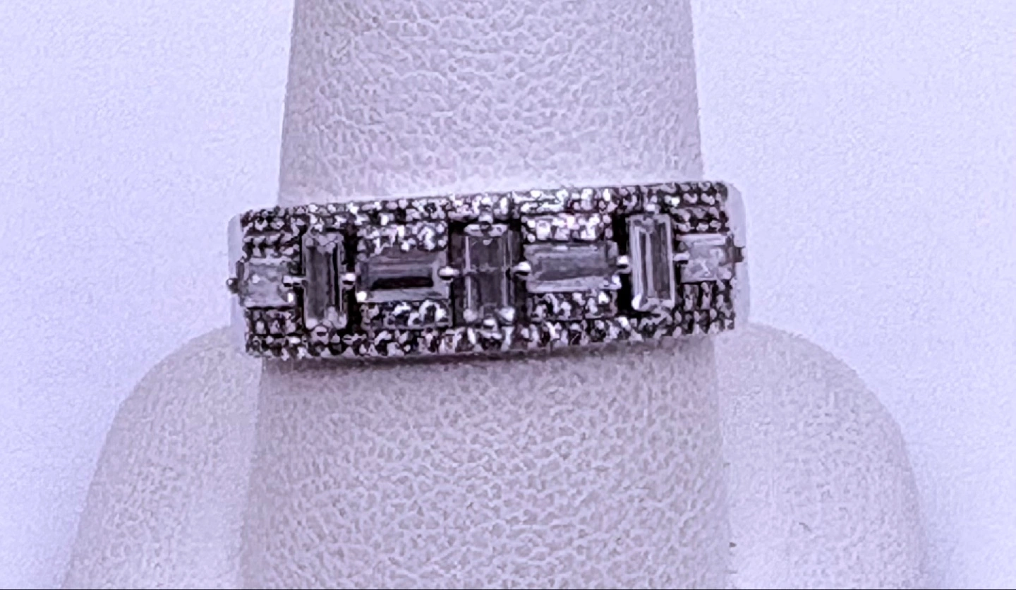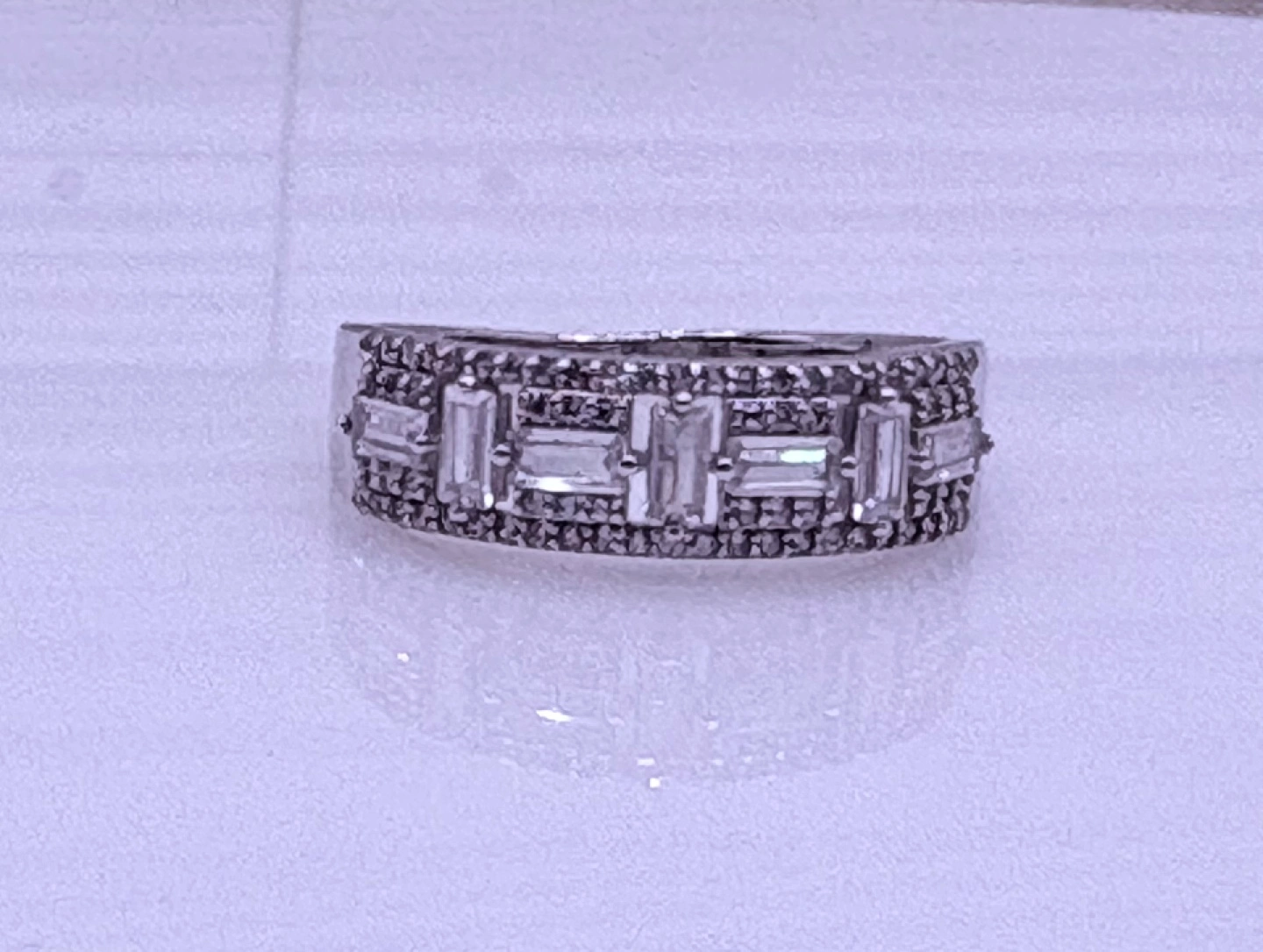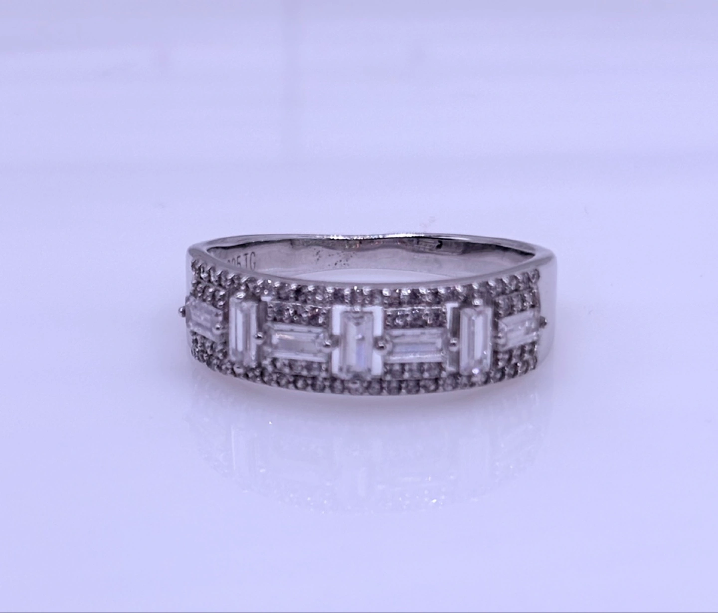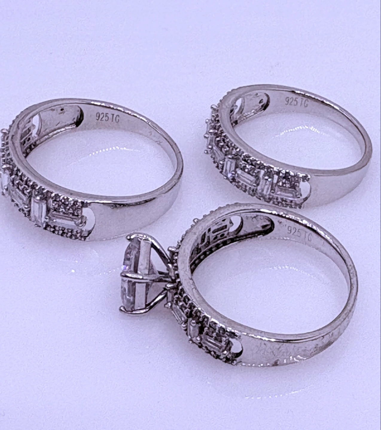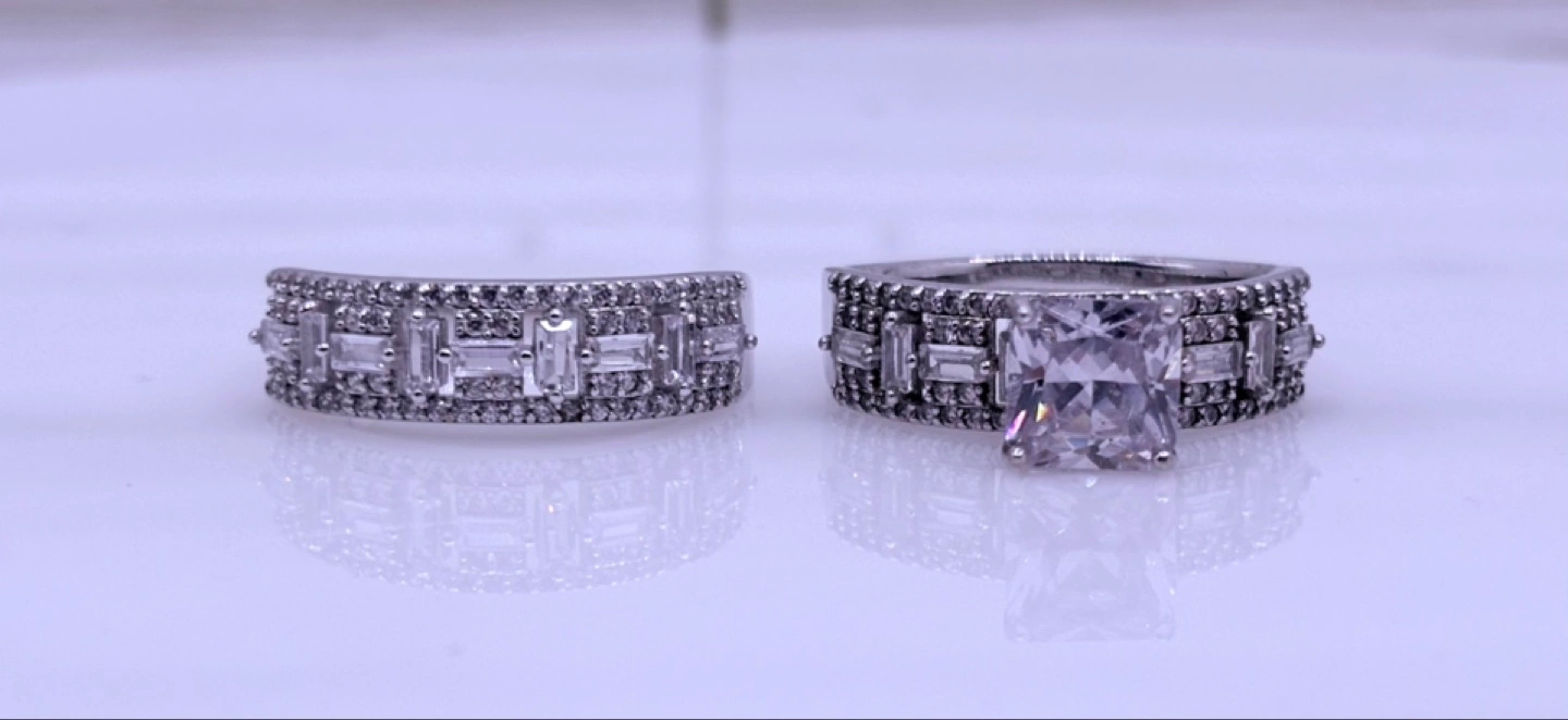 Beautiful trio-bridal ring set. Features baguette and princess-cut cubic zirconia stones. Elegant and sparkly. Perfect for a wedding or special occasion.