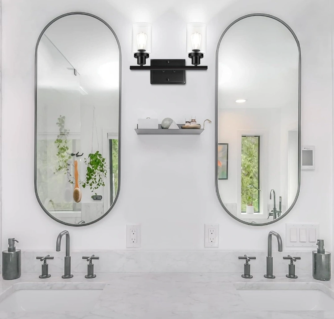 Stylish matte black finish vanity light. Features two clear glass shades. E26 base bulbs required, not included. Universal mounting plate. Perfect for bathroom or bedroom. new.