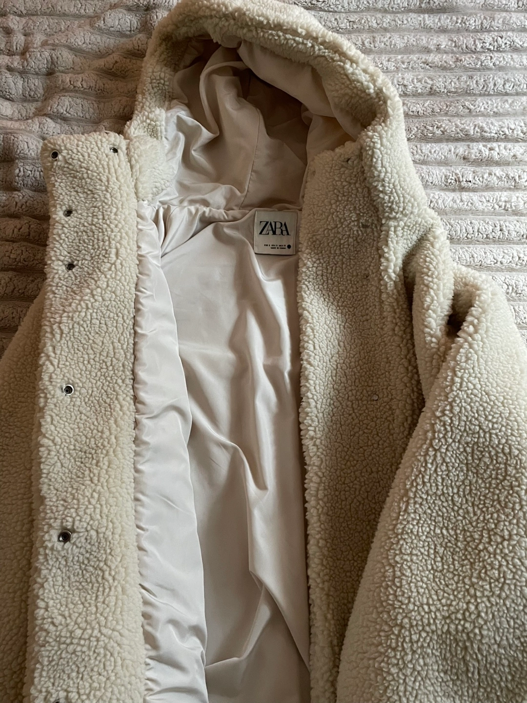 102Cozy cream-colored sherpa jacket. Features a hood and snap button closure. Worn once