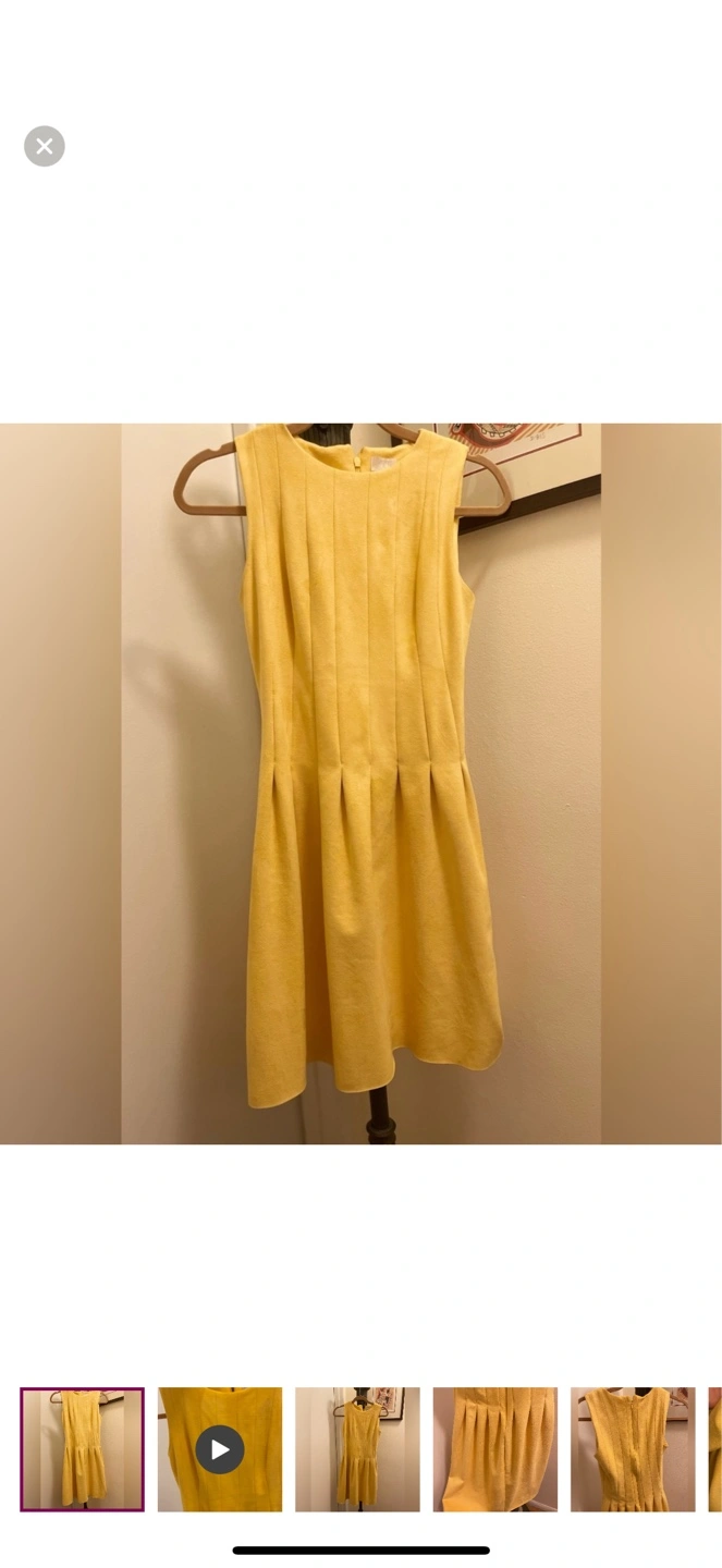 272Adorable yellow dress. Sleeveless, fit and flare silhouette. Back zipper closure. Pleated skirt. Suede-like texture.