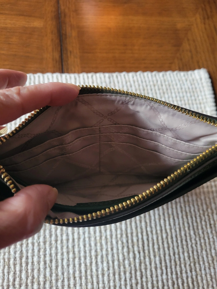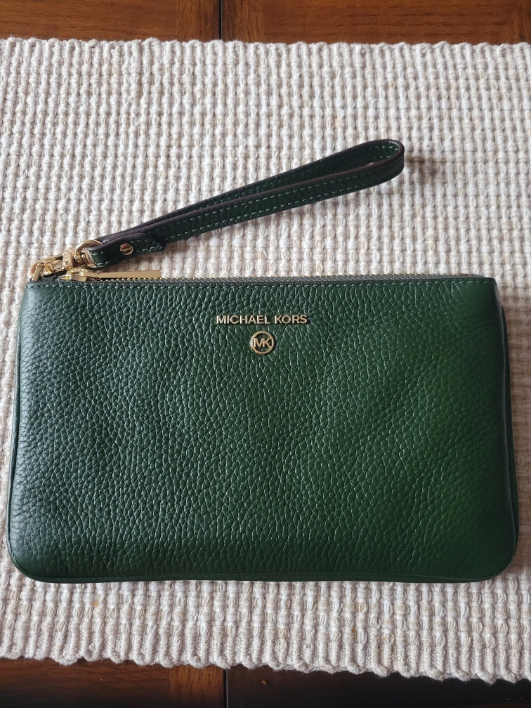 Dark green leather wristlet. Zip closure. Interior pockets. Small wrist strap. Brand new, removed tags but was not able to use. Purchased from Macy's a couple of yrs ago.