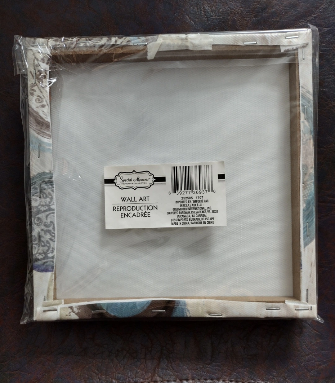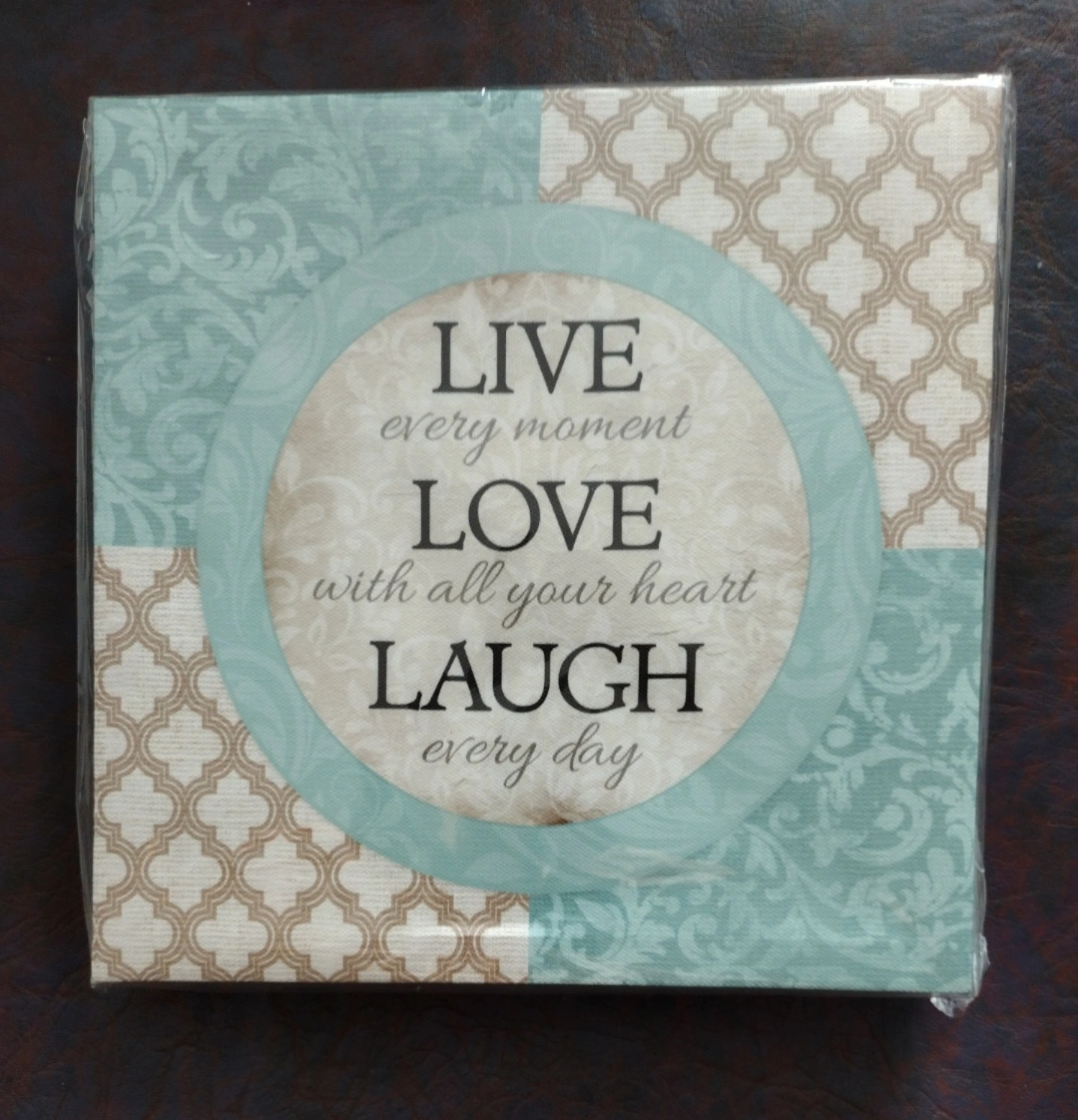 Framed canvas wall art. Inspirational quote: Live every moment, Love with all your heart, Laugh every day. Neutral colors, decorative patterns. New, in plastic wrap.