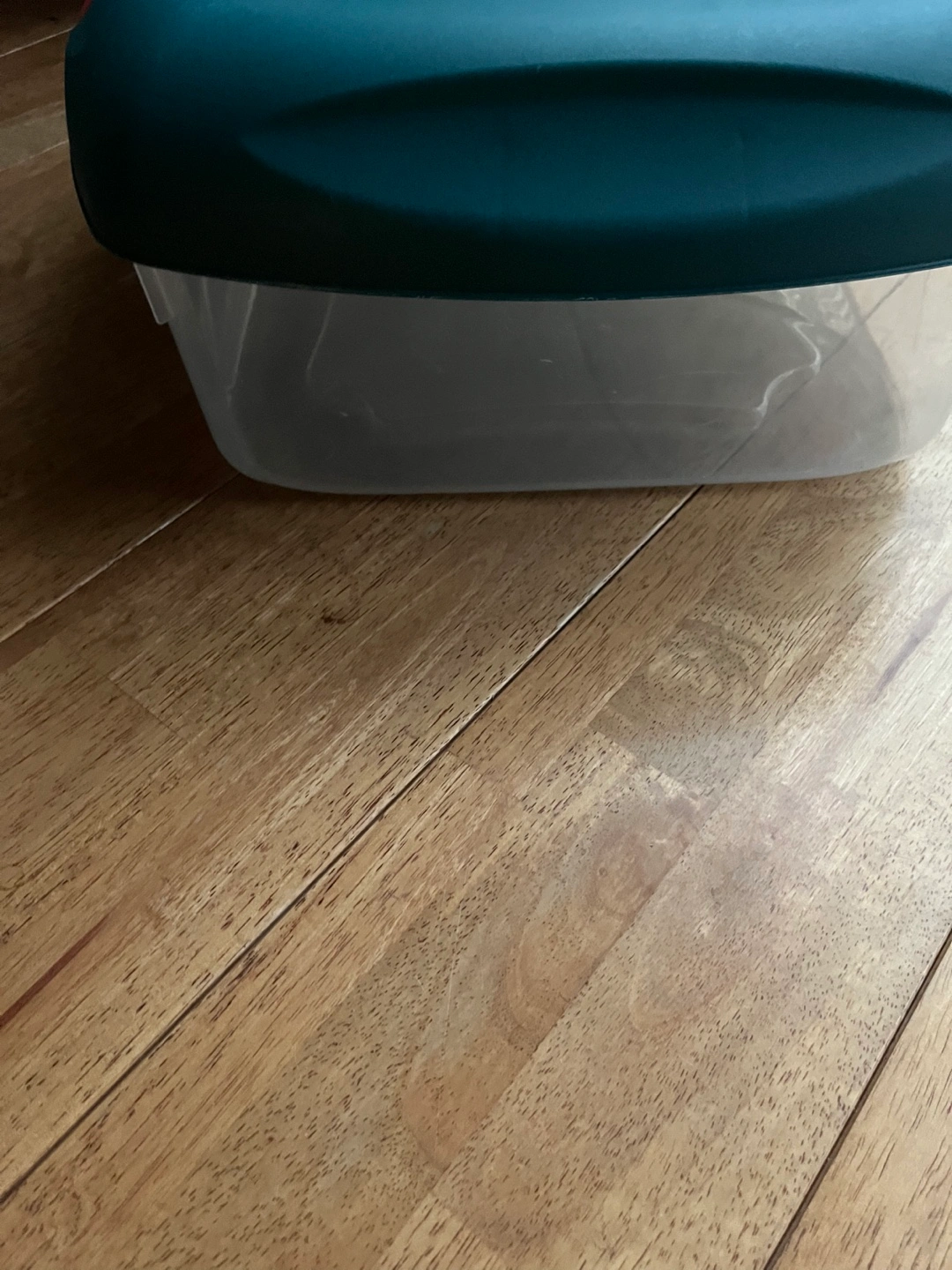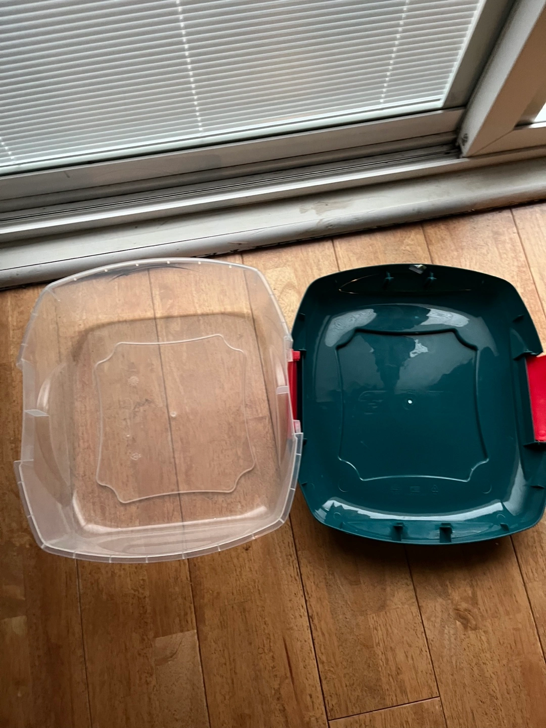 15Plastic storage container. Clear body, dark green lid. Good for organizing small items. Lid snaps on securely.