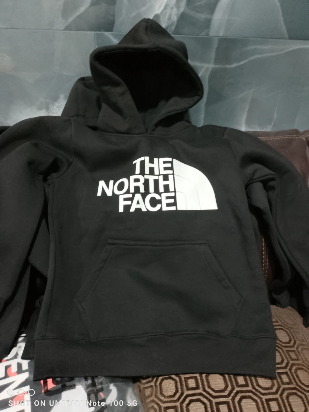 Black hoodie with The North Face logo on the chest. It's a comfortable pullover style with a front pouch pocket. Made from a soft fabric blend.