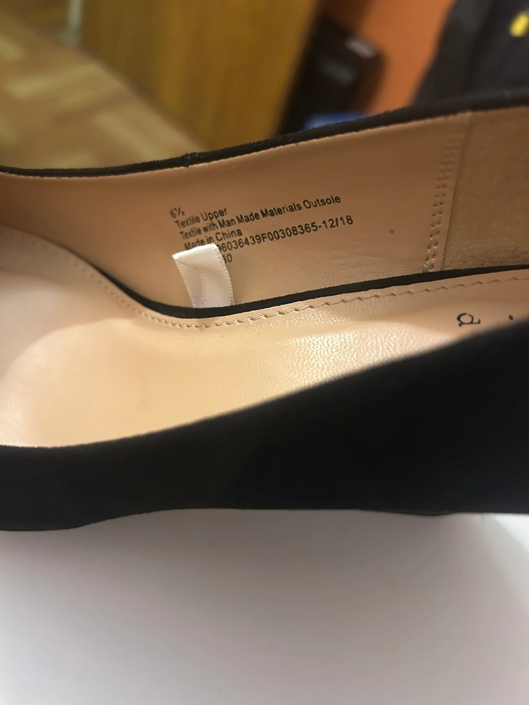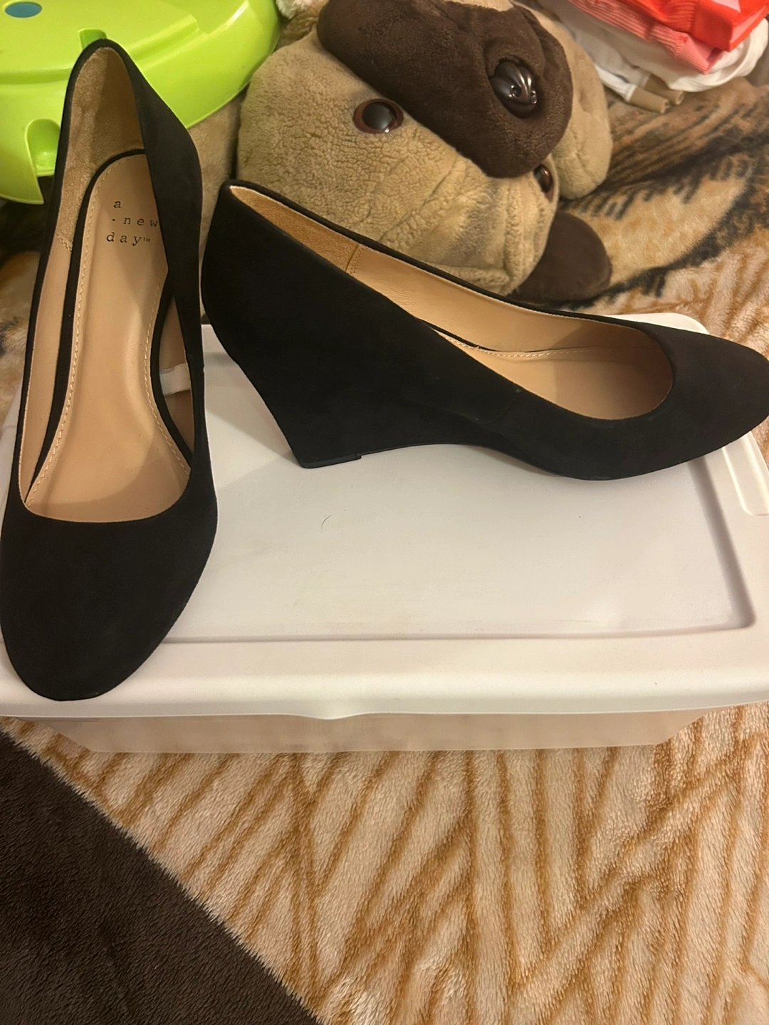 Black suede-like wedge heels. Slight wedge heel. Pointed toe.