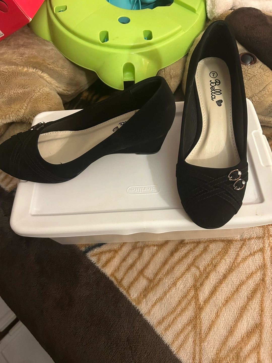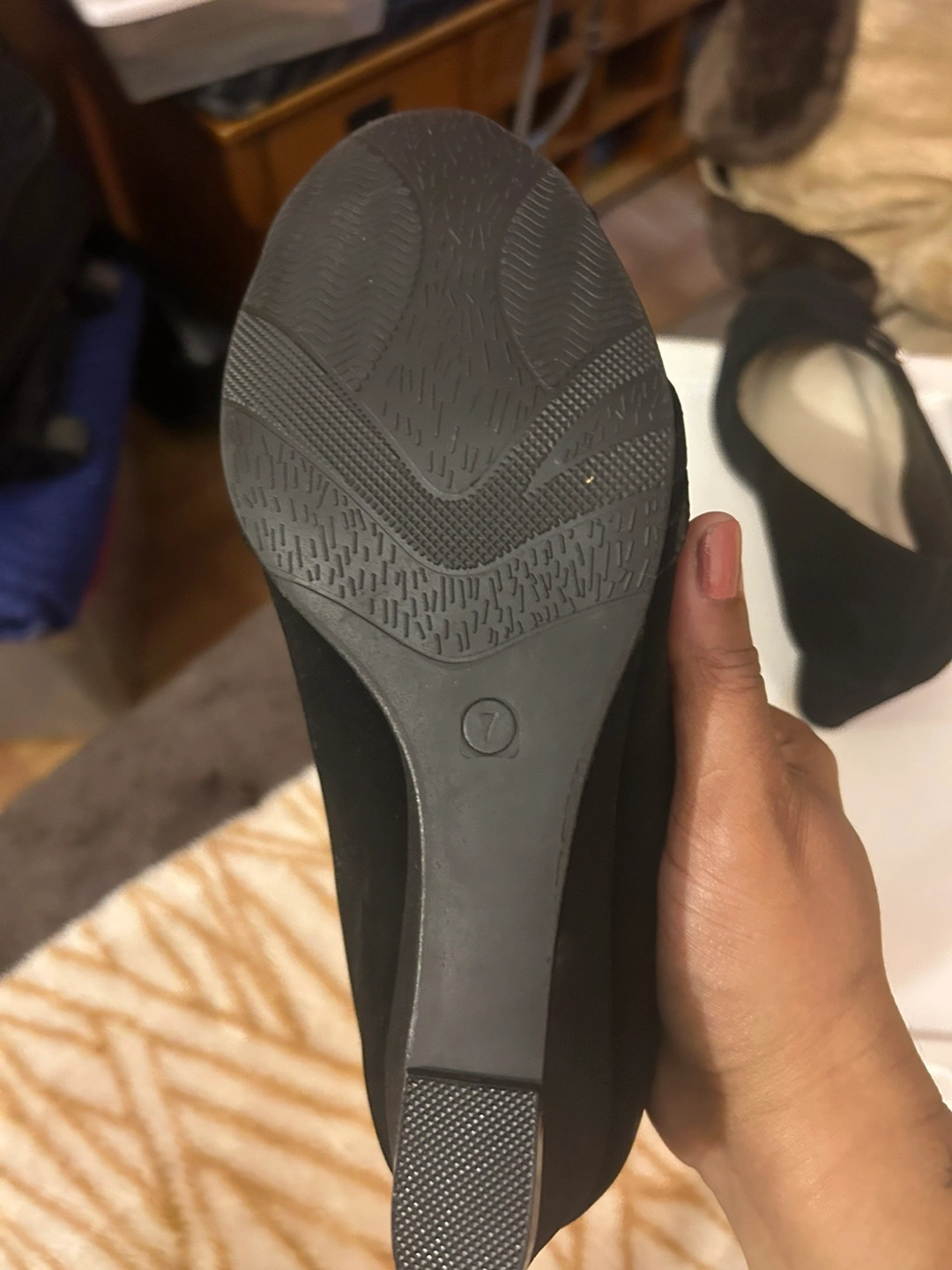 Black suede-like wedge heel shoes. Size 7. Small embellishments on the toe. Wedge heel. Pre-owned.