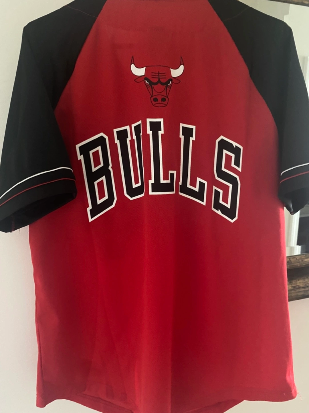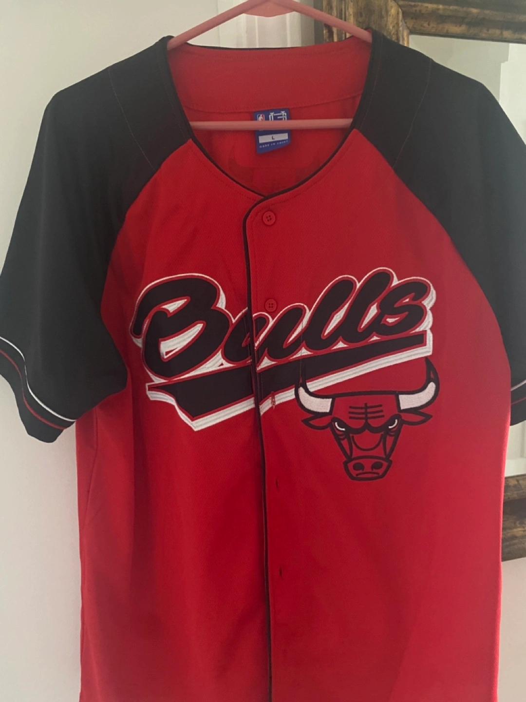 Men's Chicago Bulls baseball jersey. Red and black. Size Large. Button closure. Embroidered logo.