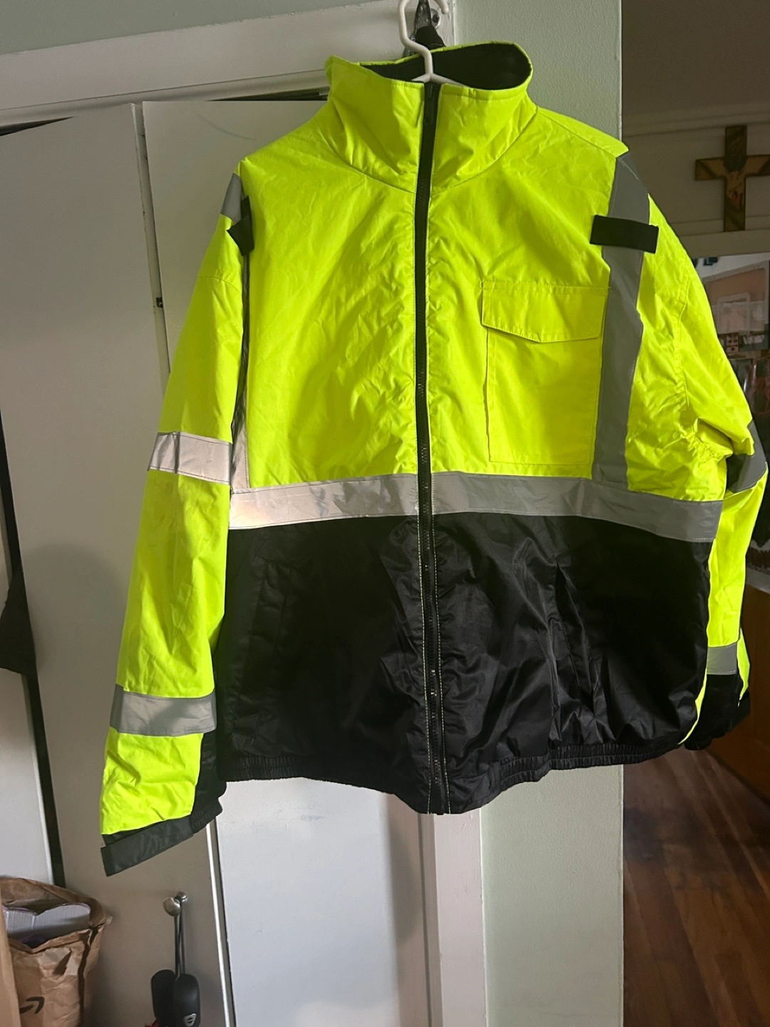 Men's size XXL. Black and neon yellow. Zipper closure. Reflective strips. Fleece lining. Small marks on sleeve.