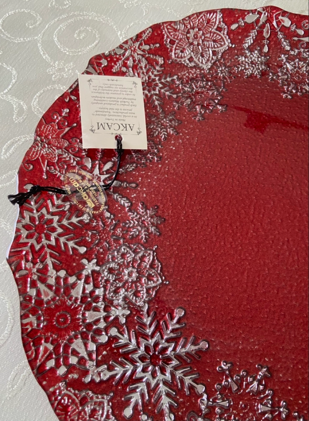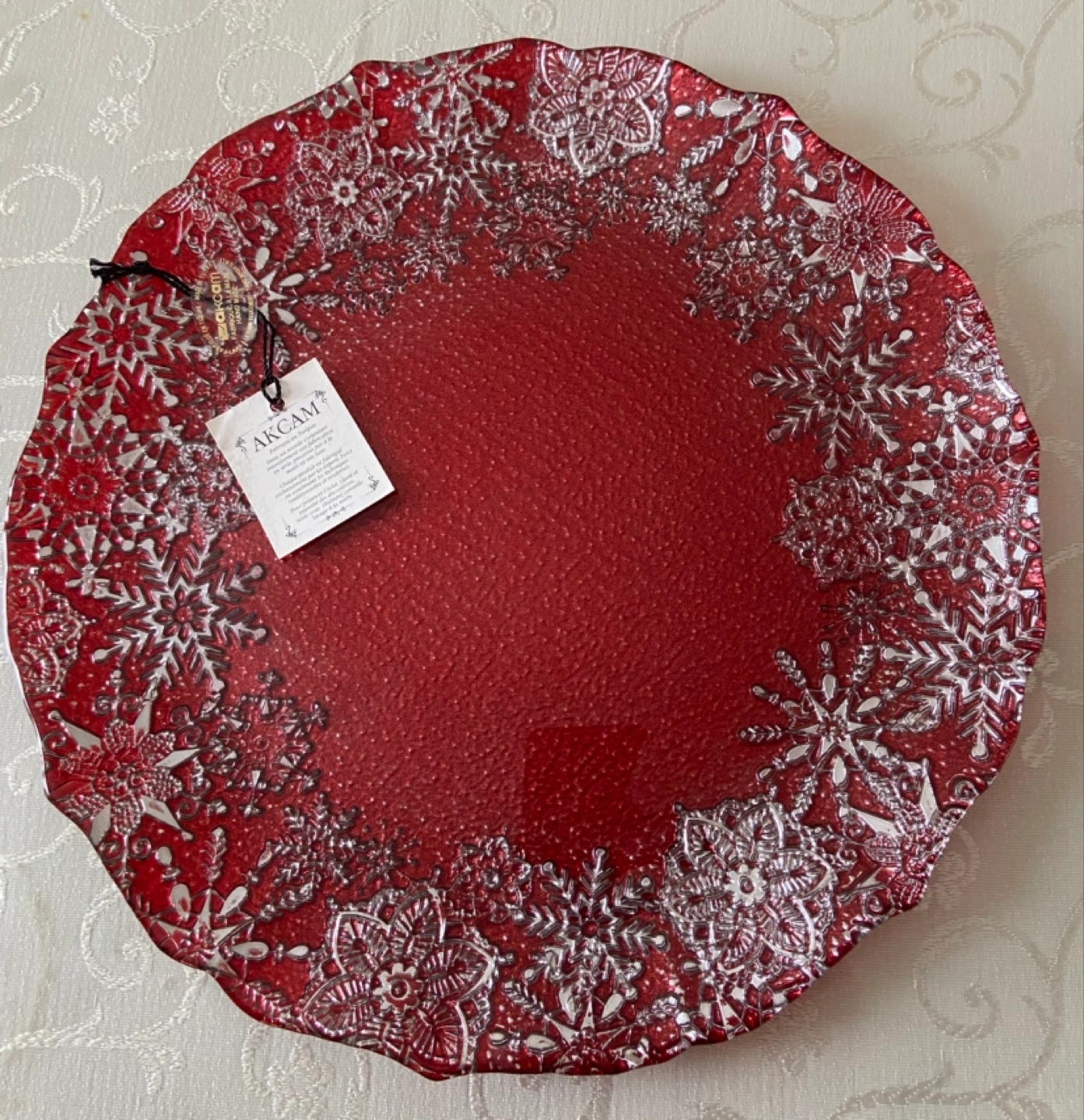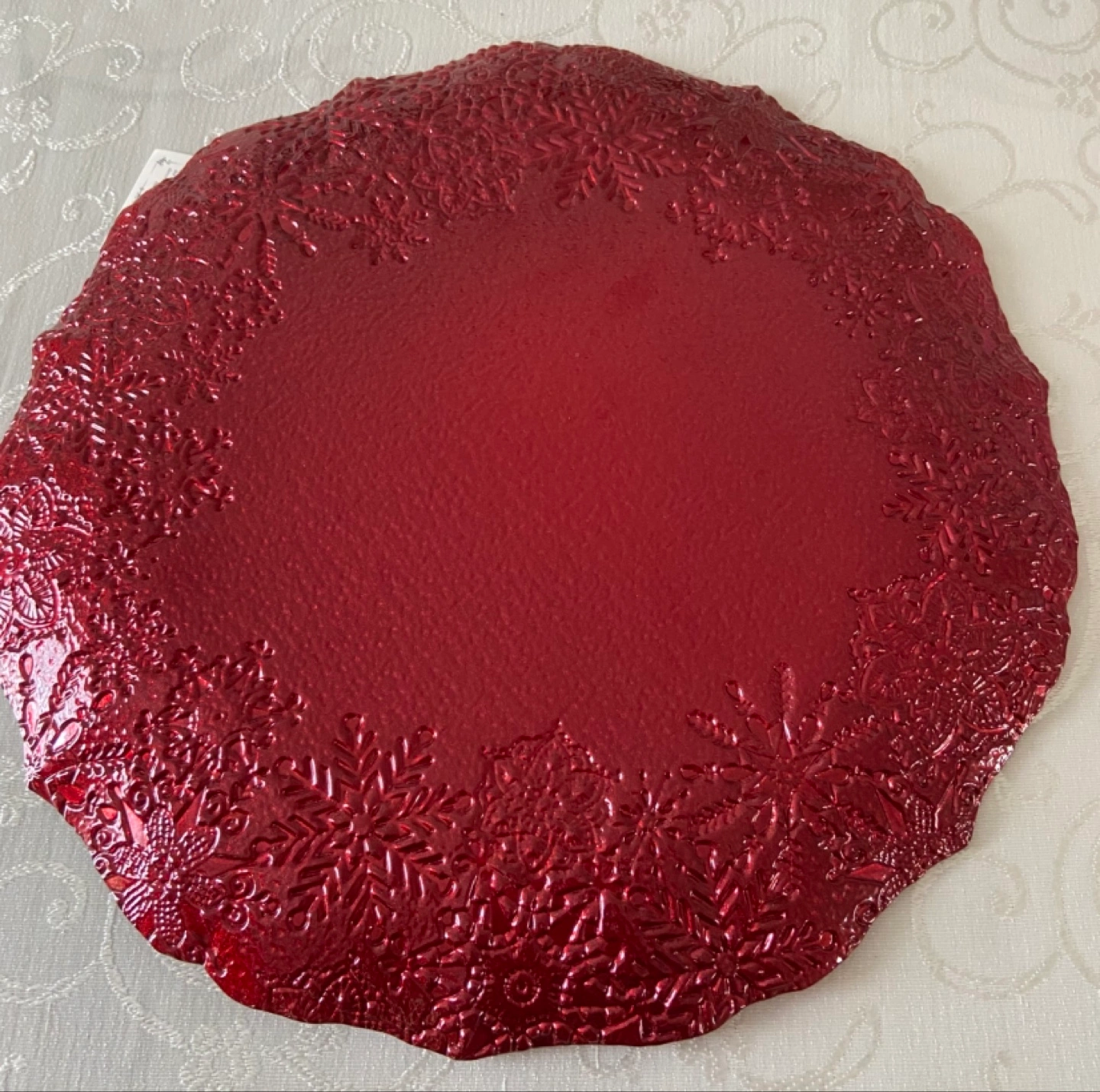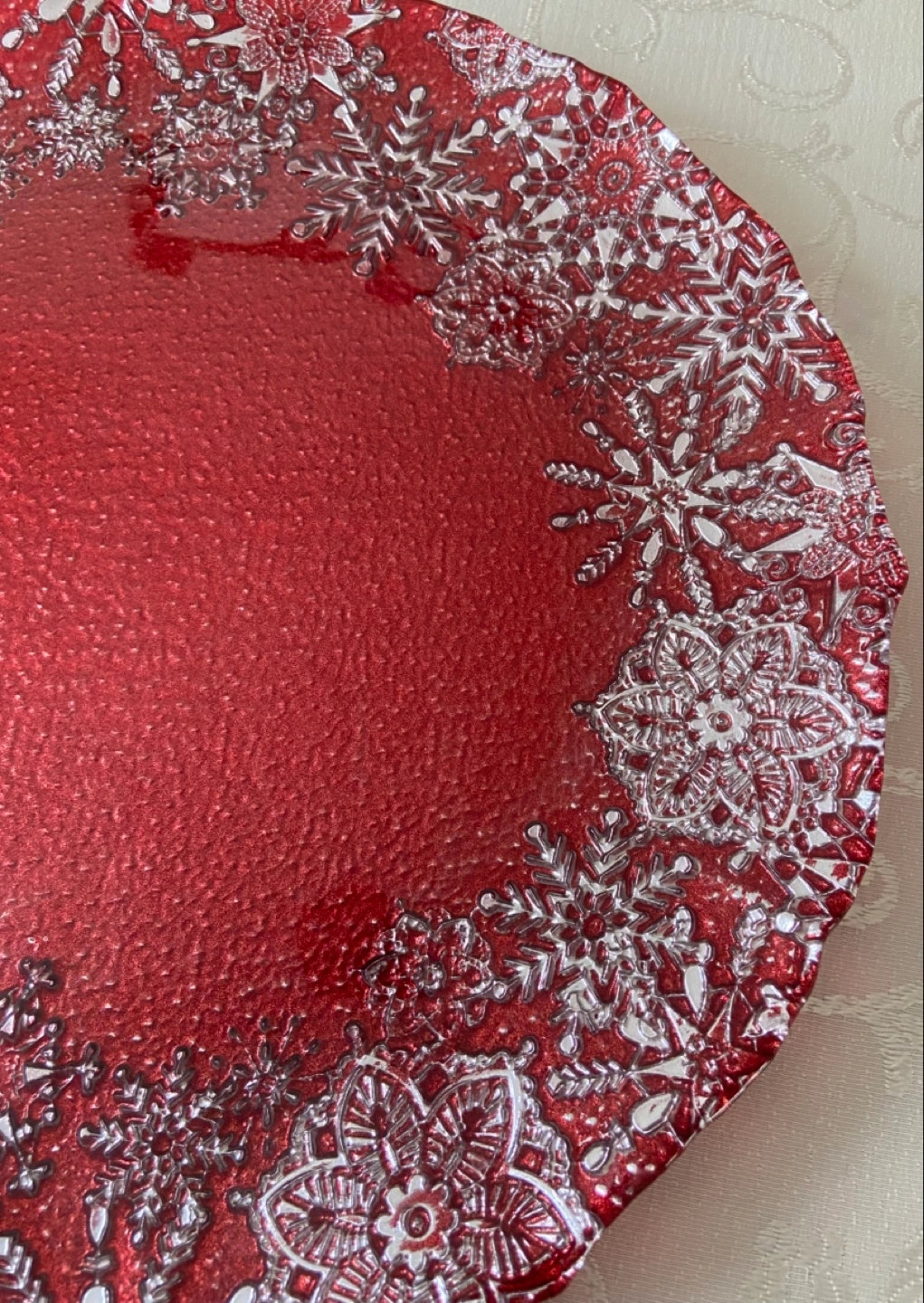 Large round charger plate. Red glass with a textured surface. Silver snowflake and floral design around the edge. Perfect for holiday entertaining.