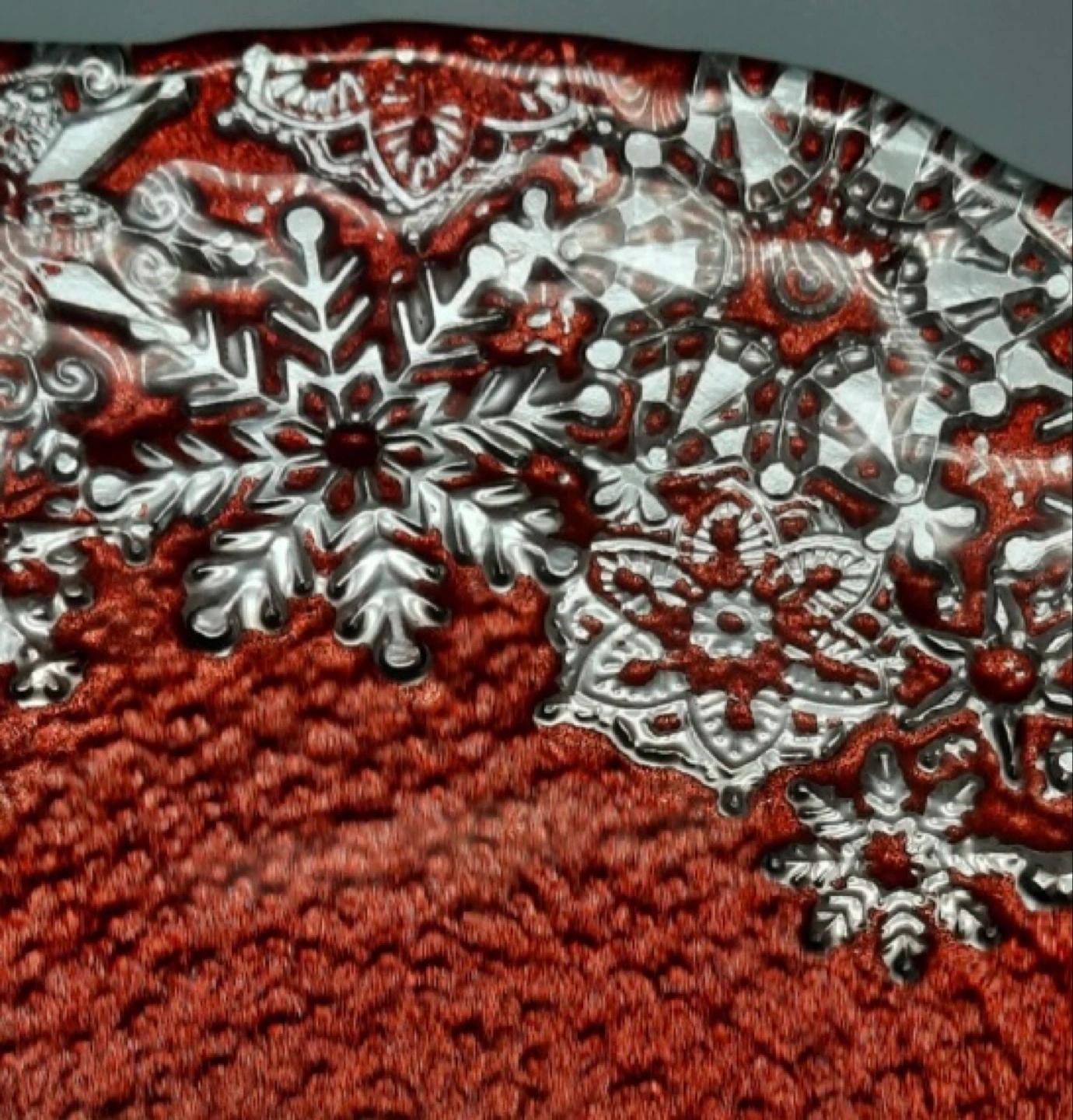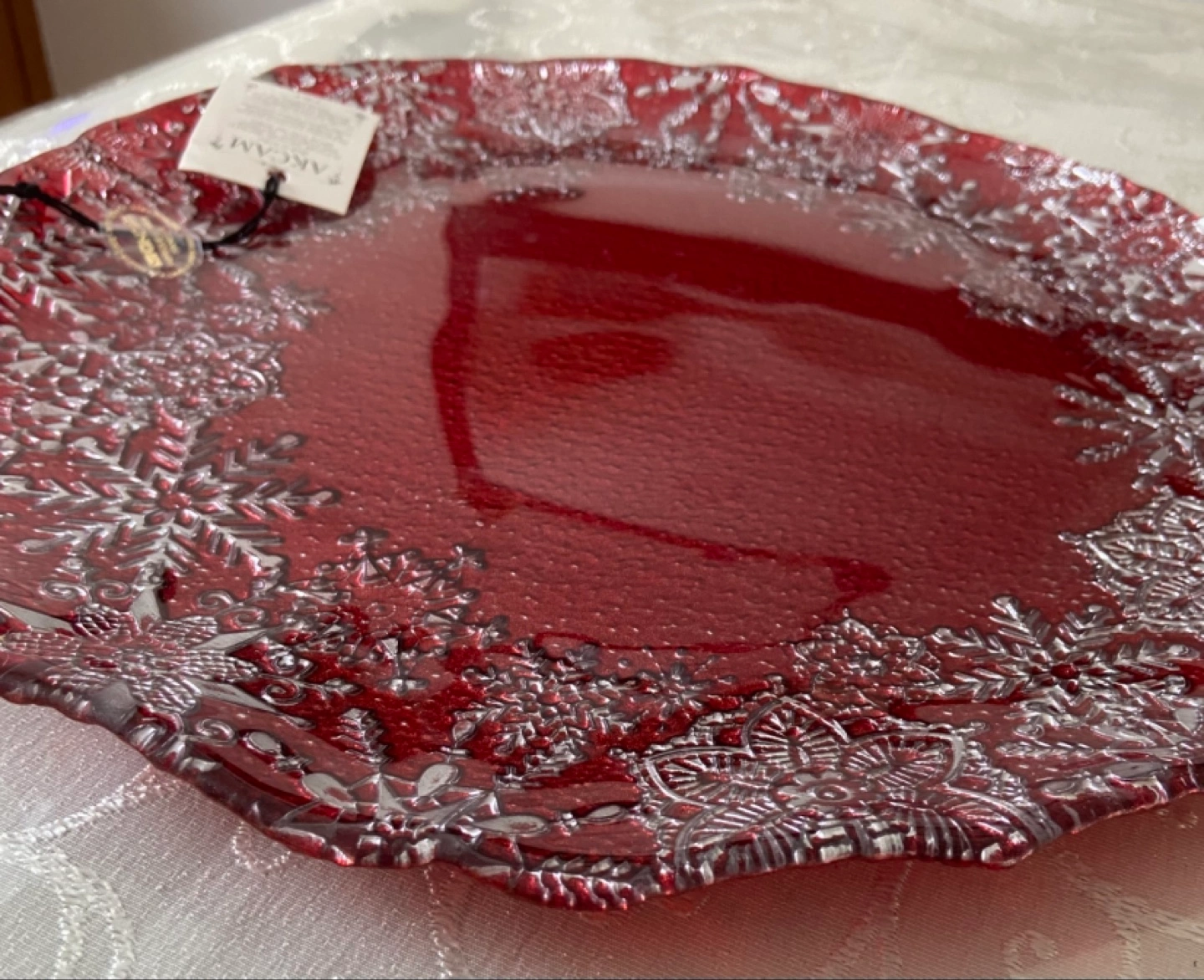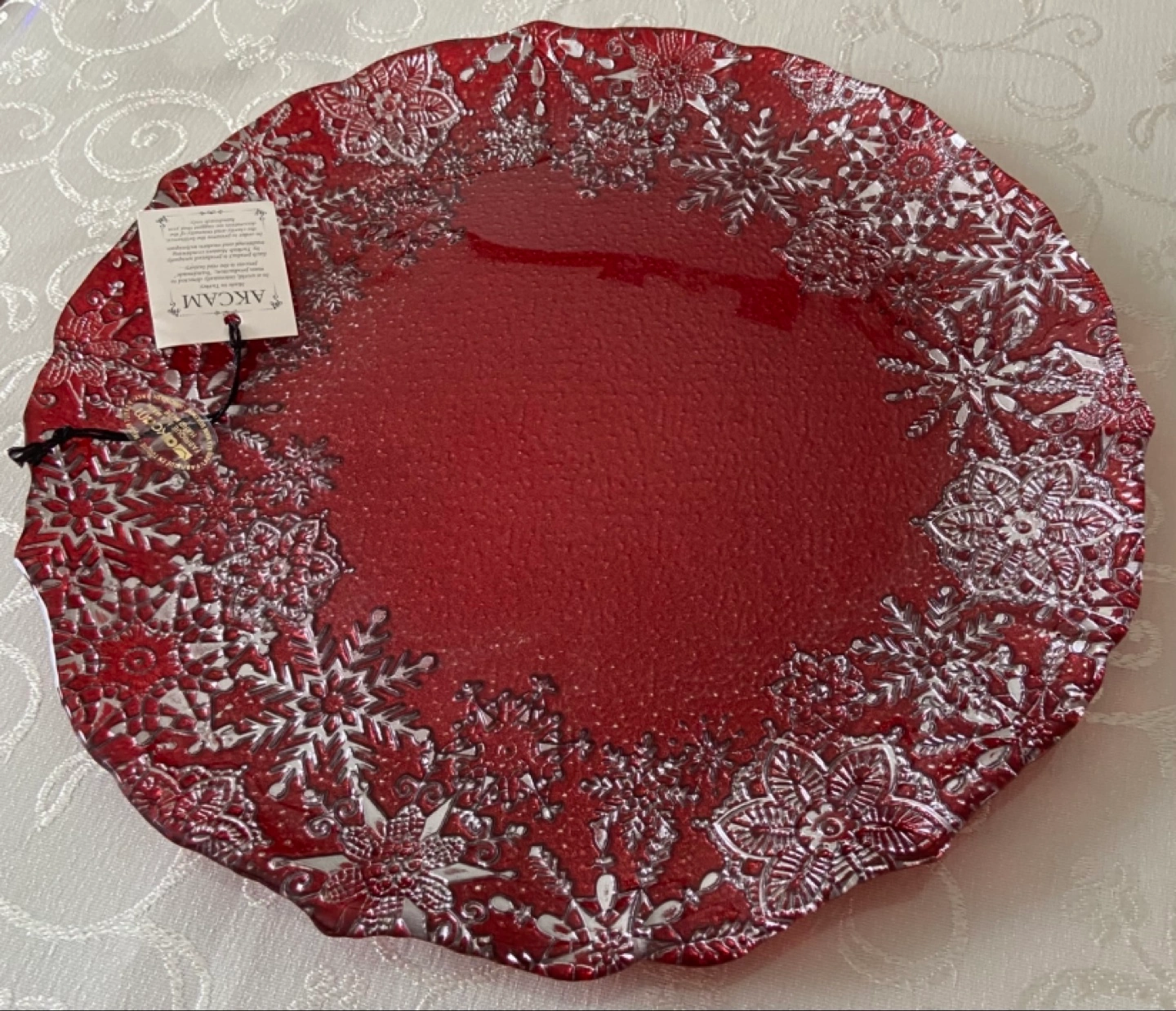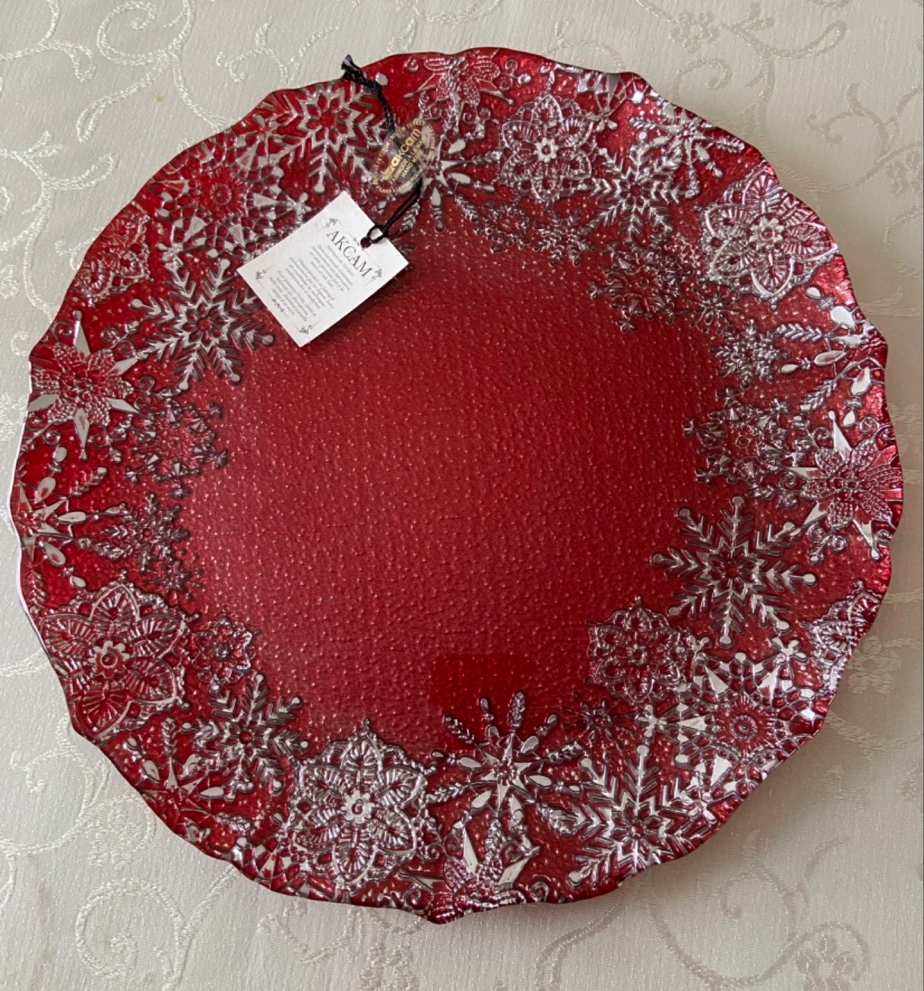 Large round charger plate. Red glass with a textured surface. Silver snowflake and floral design around the edge. Perfect for holiday entertaining.