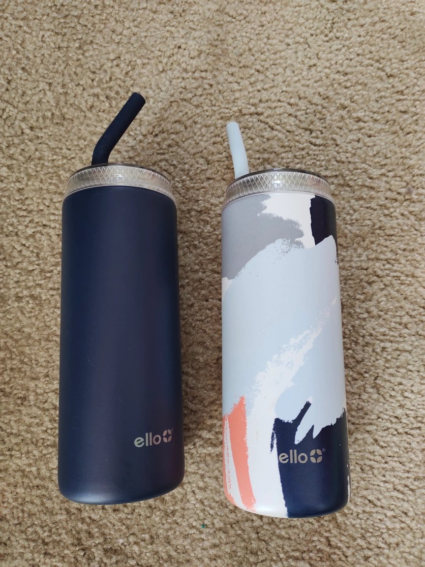 Two stainless steel tumblers with lids and straws. One navy blue, one abstract print. Great for everyday use. ๐