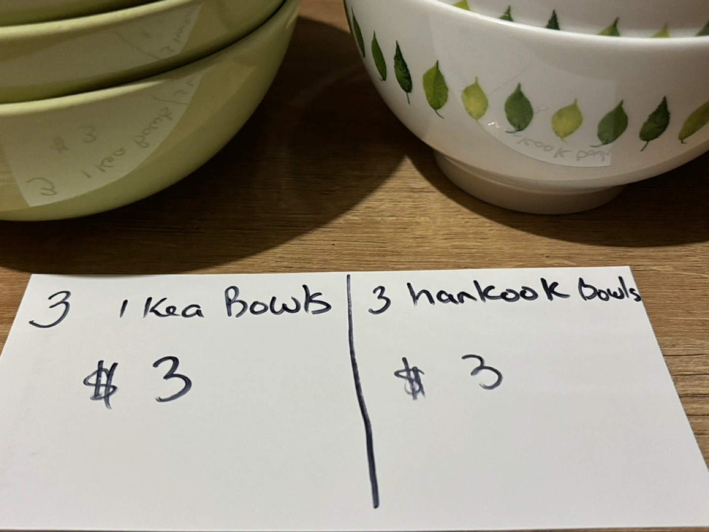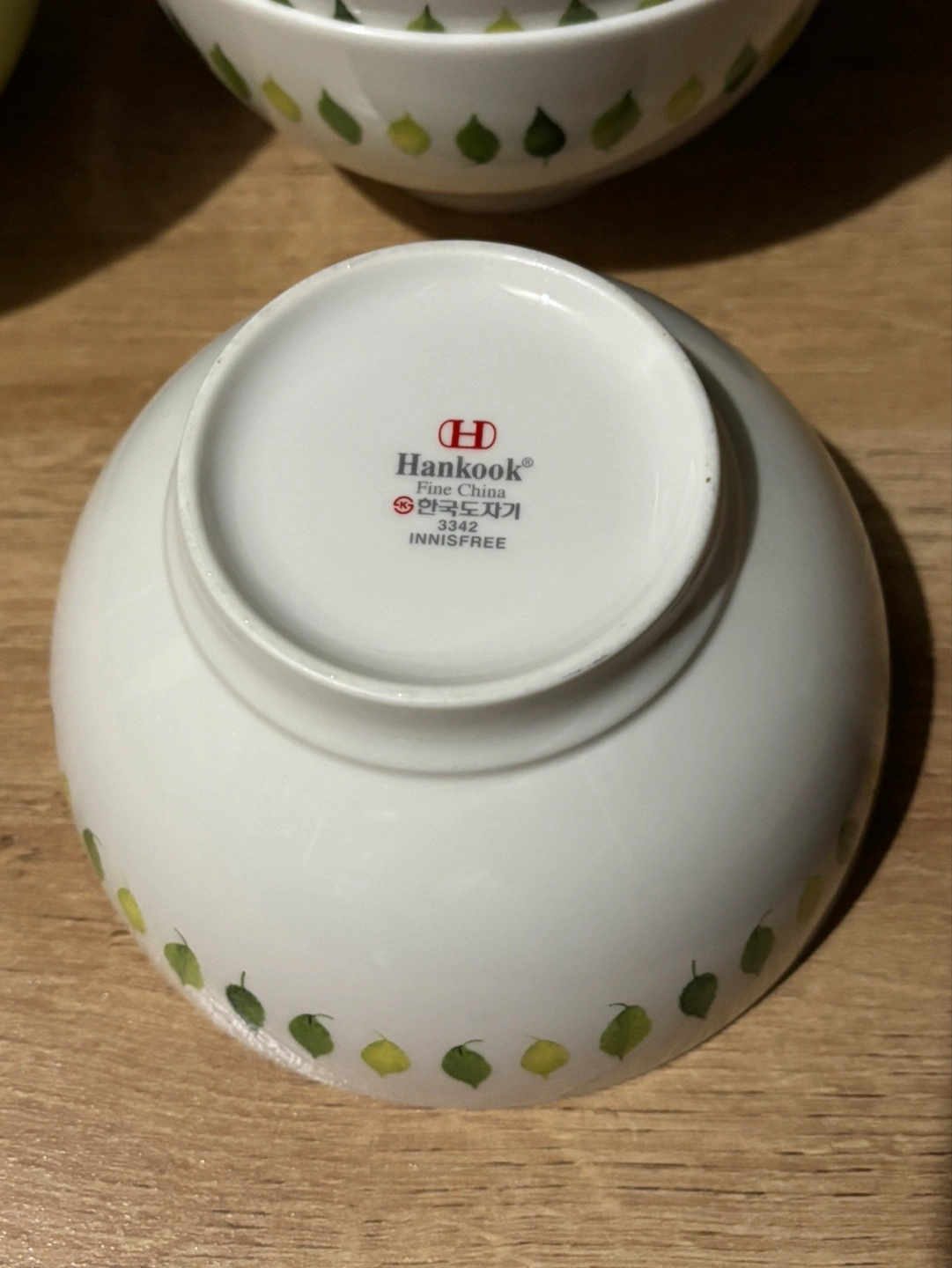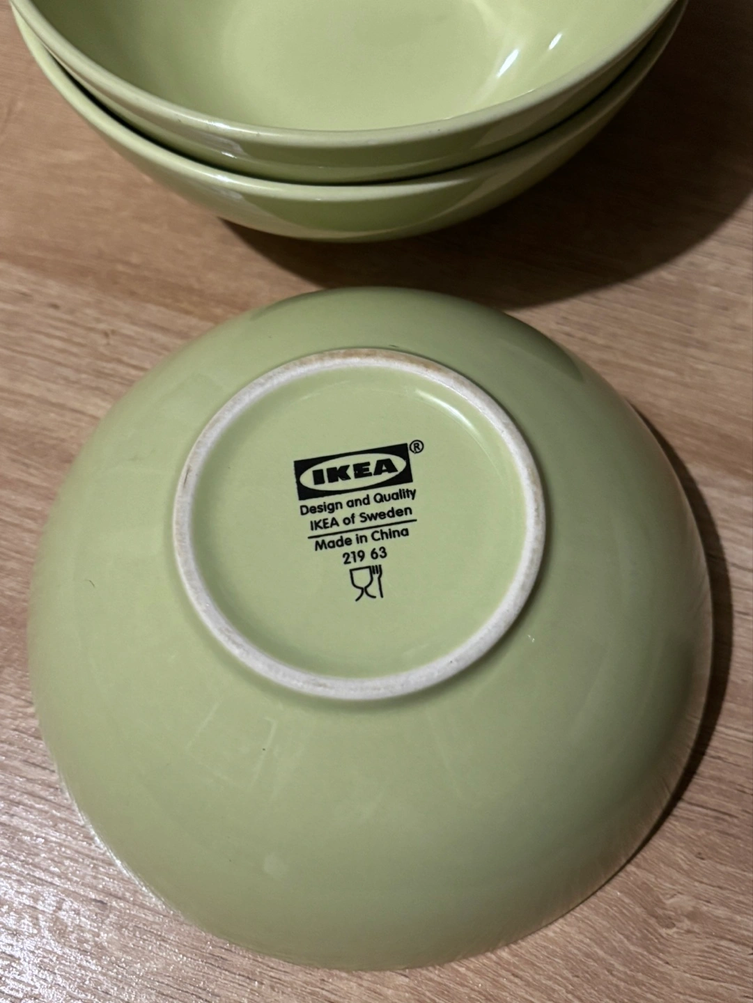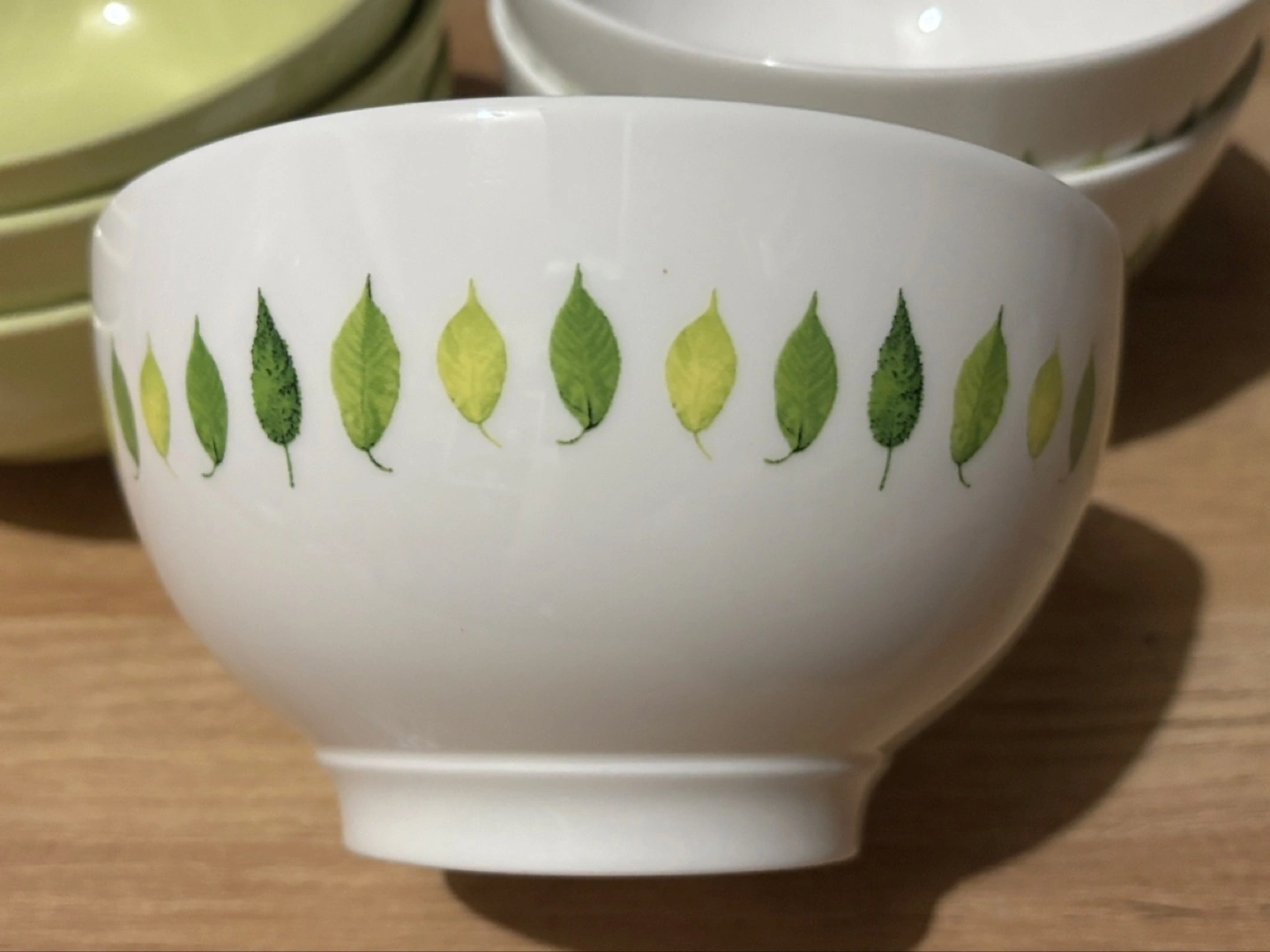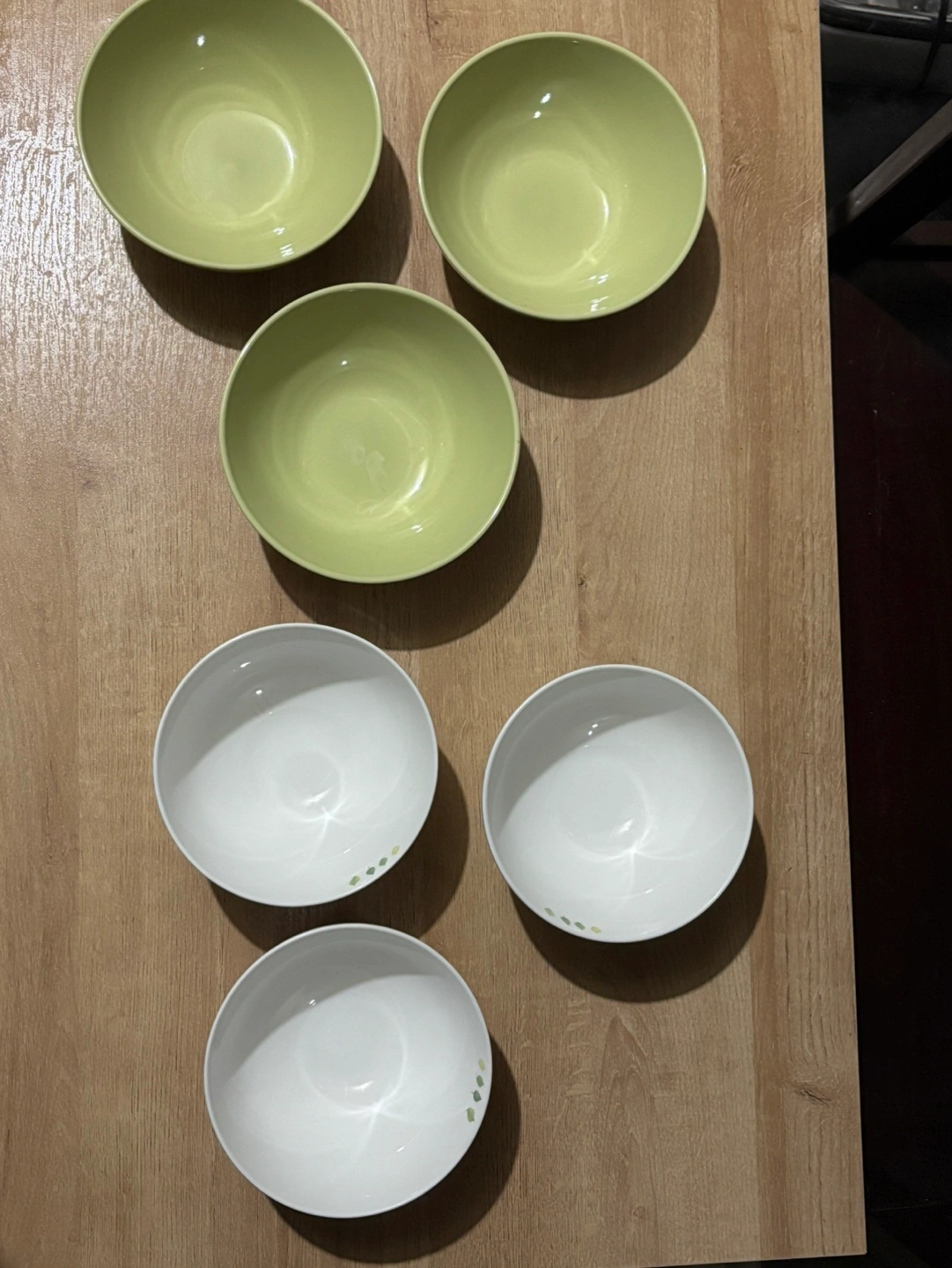 91Set of six bowls. Three light green IKEA bowls. Three white Hankook bowls with leaf design. Good condition. Sold as a set.