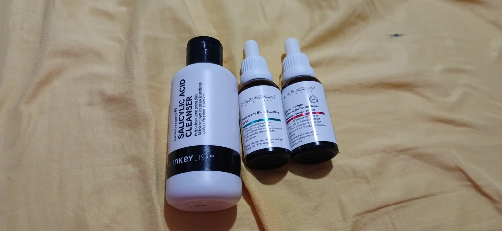 1000+Inkey List Salicylic Acid Cleanser and two Cellnique serums. One serum is Niacinimide 5% Squalane and the other is Peptide 1-youth Perfect Tight Repair Serum.