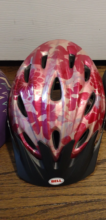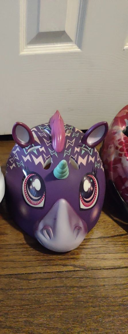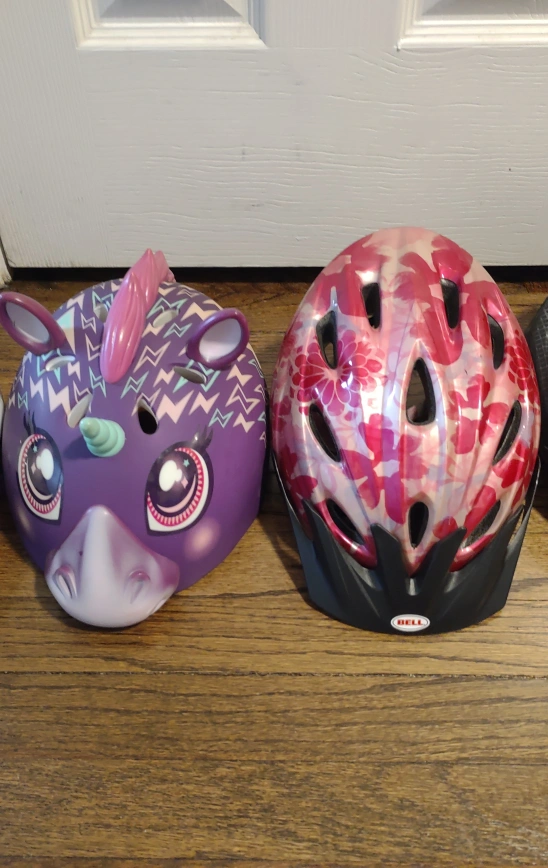 44Two children's bike helmets. One features a purple unicorn design. The other has a pink floral pattern.