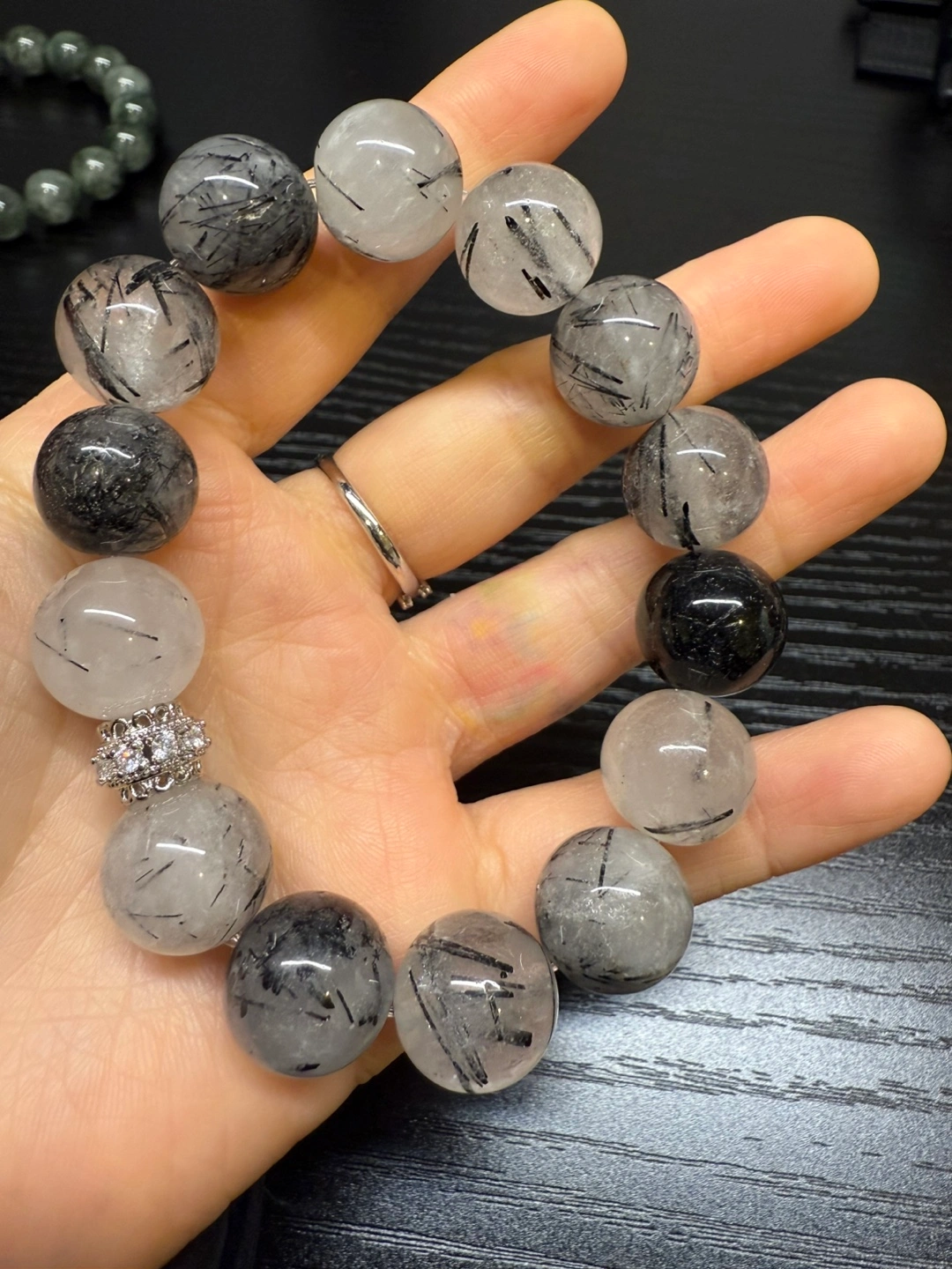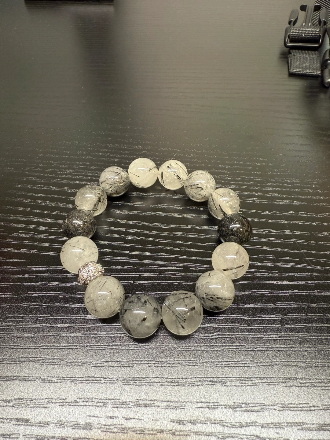 65Beautiful bracelet. Features round beads of black tourmaline and clear crystal . Small rhinestone accent. Elegant and stylish.