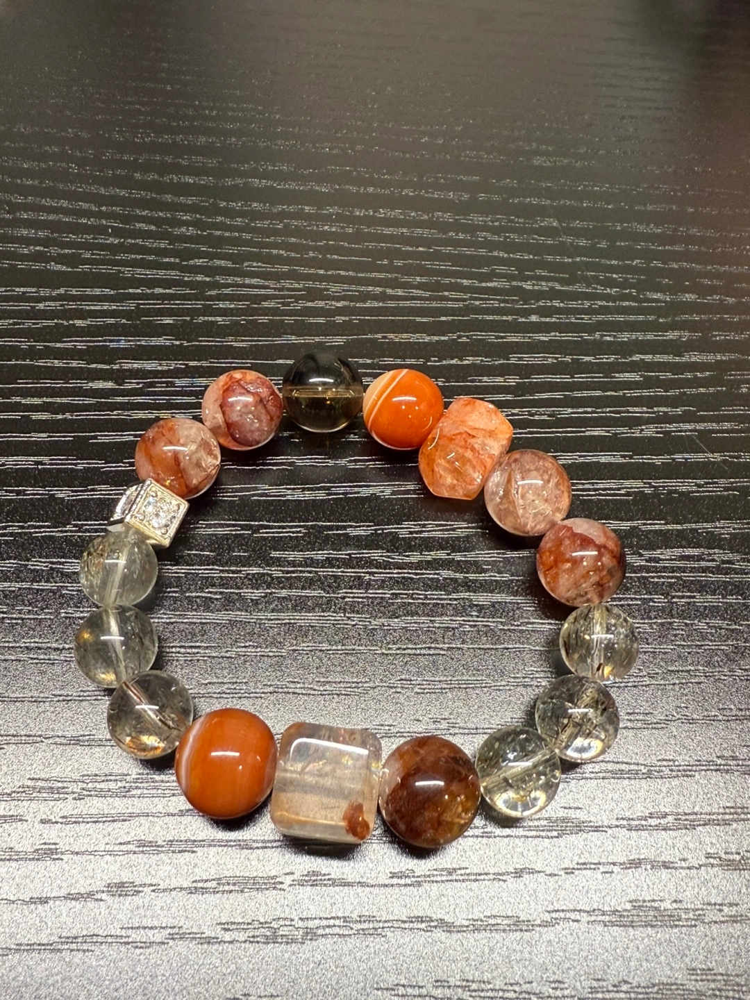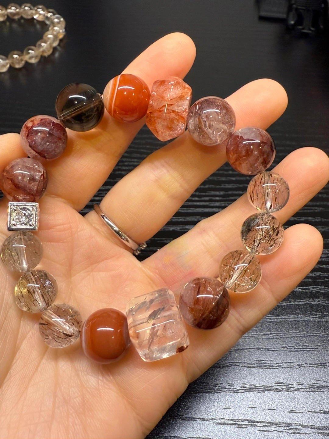 65Unique beaded bracelet. Features red and clear quartz beads, silver accents(S925). Stretchy band. Elegant design. Perfect for everyday wear or special occasions.