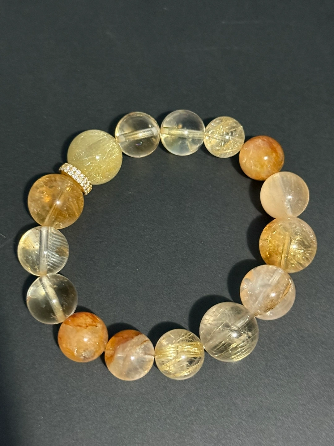 65Beautiful bracelet. Features round gold rutilated quartz beads. Sparkly CZ spacer. Elegant and eye-catching.
