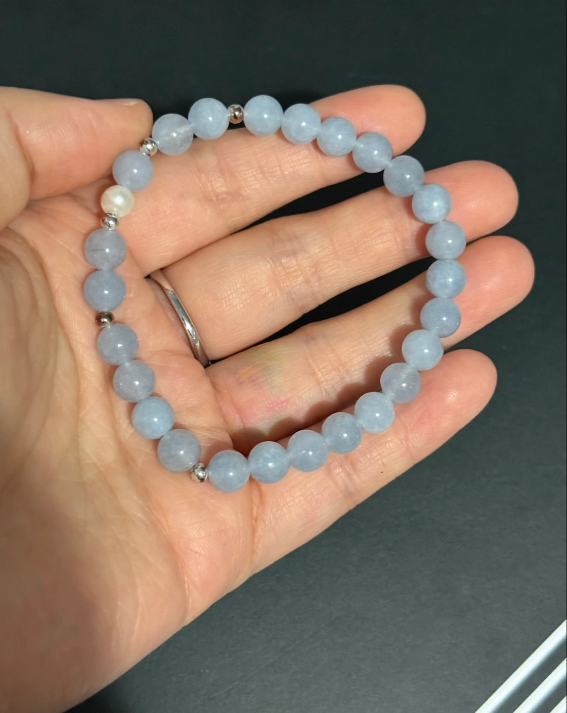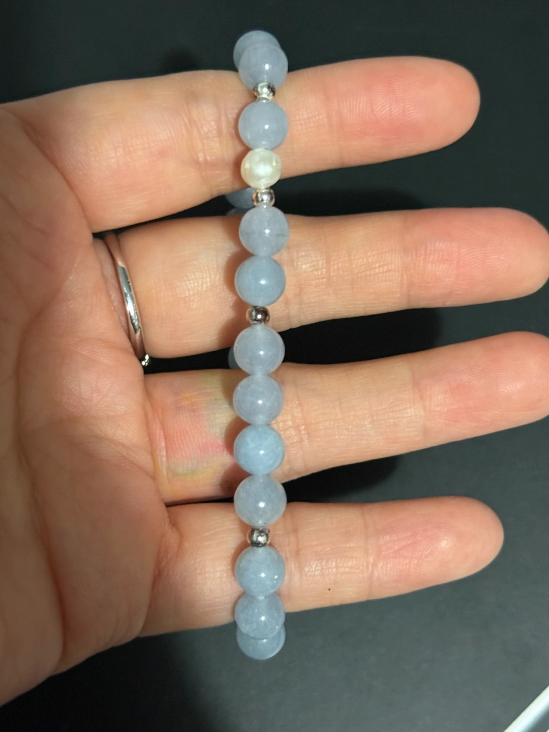 65Pretty beaded bracelet. Features aquamarine beads and one pearl. Silver metal accents between beads. Stretchy bracelet.
