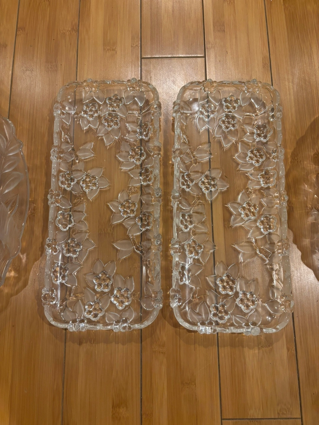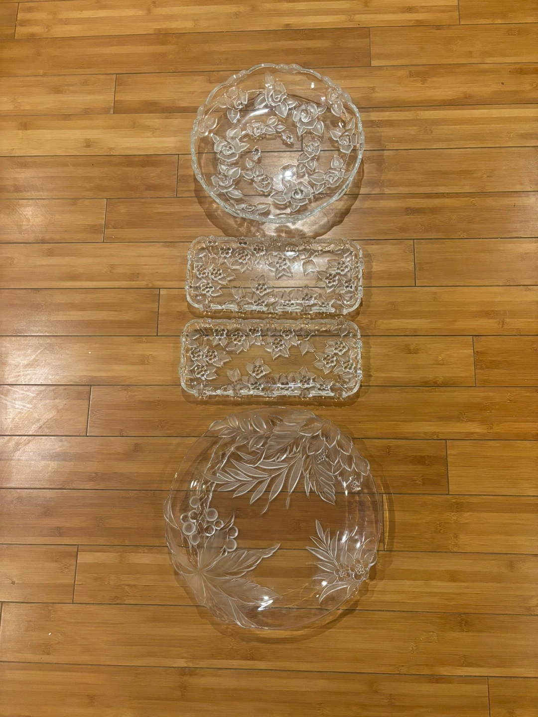 Beautiful set of crystal serving platters. Includes two rectangular trays and two round platters. Floral etching. Perfect for entertaining or adding elegance to your home.