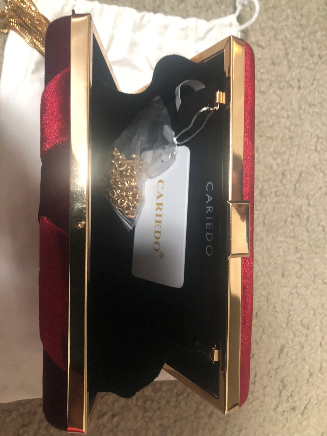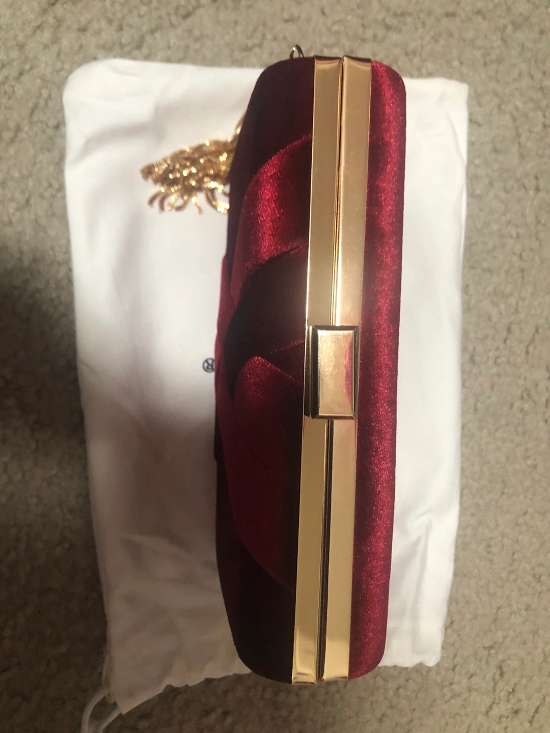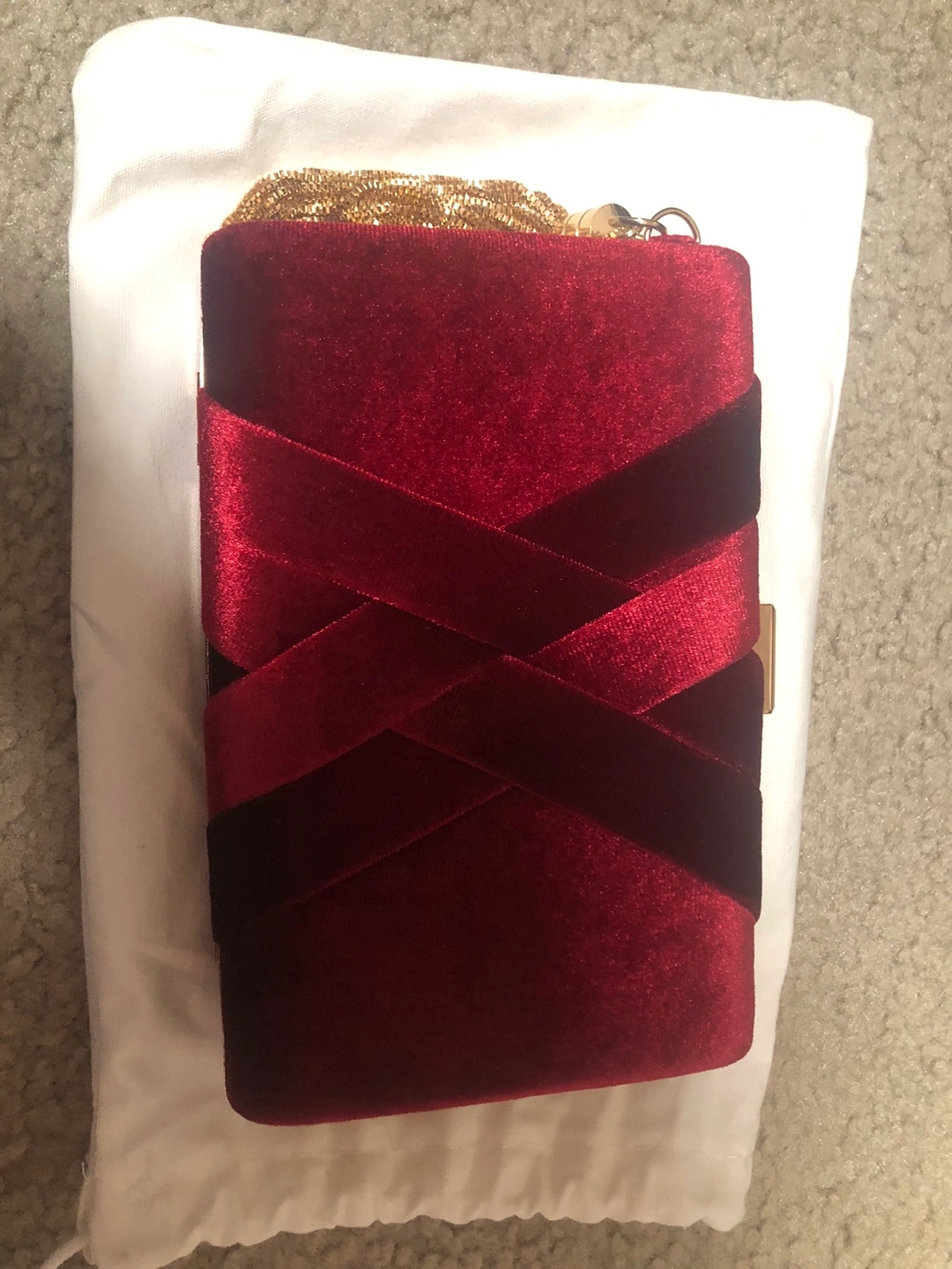 30Red velvet clutch purse. Gold-toned hardware and clasp. Features a decorative pleated design and a detachable gold chain tassel. Comes with a dust bag.