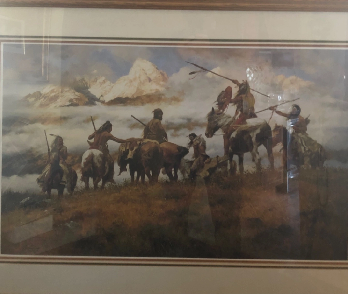 20Framed print depicting Native Americans on horseback. Mountains and clouds in background. Beautiful colors and detail.