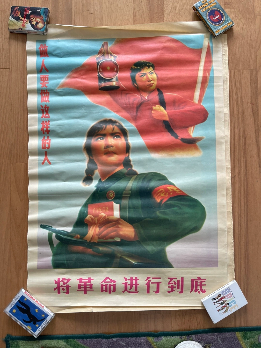 Large format vintage poster. Depicts two women, one holding a rifle and a book, the other holding a lantern and a red flag. Chinese text throughout. Shows signs of age and wear.