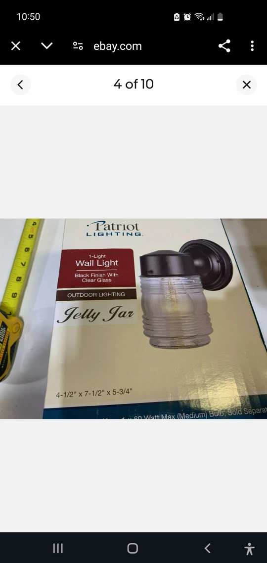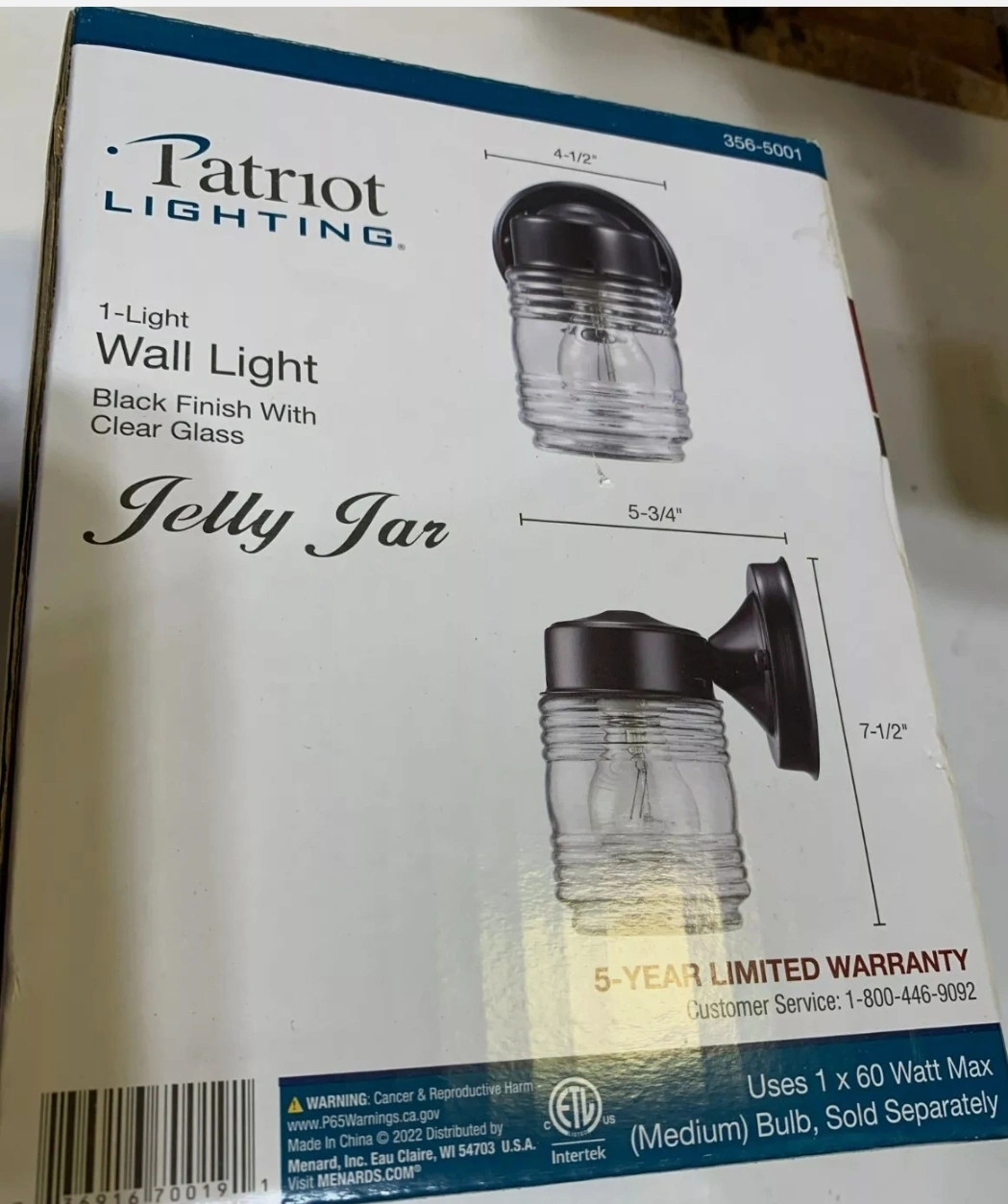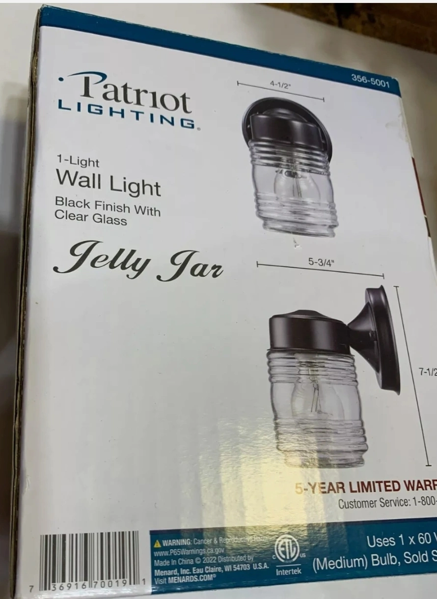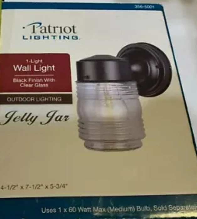 New in box. Outdoor lights. Black finish with clear glass. Uses one 60-watt max bulb (sold separately). Measures 4-1/2" x 7-1/2" x 5-3/4". Set of two.