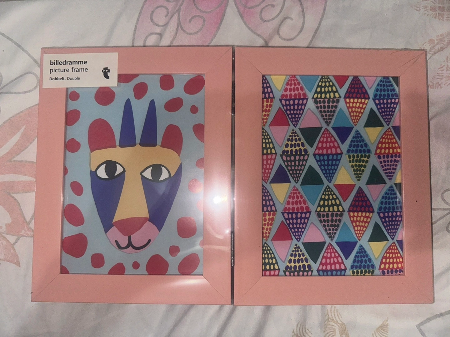 1000+Pink double picture frames. Colorful prints included. Measures 13 x 18 cm or 5.1 x 7.1 in. Made in China. New in packaging.