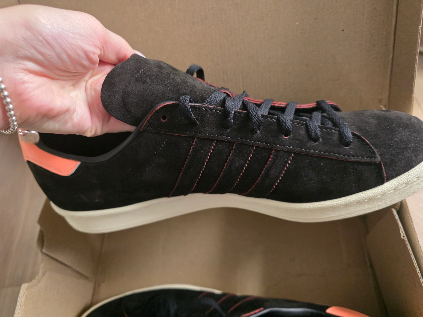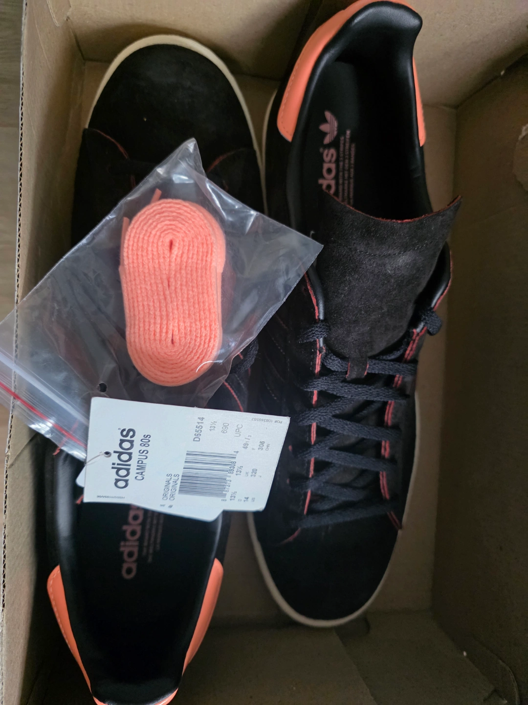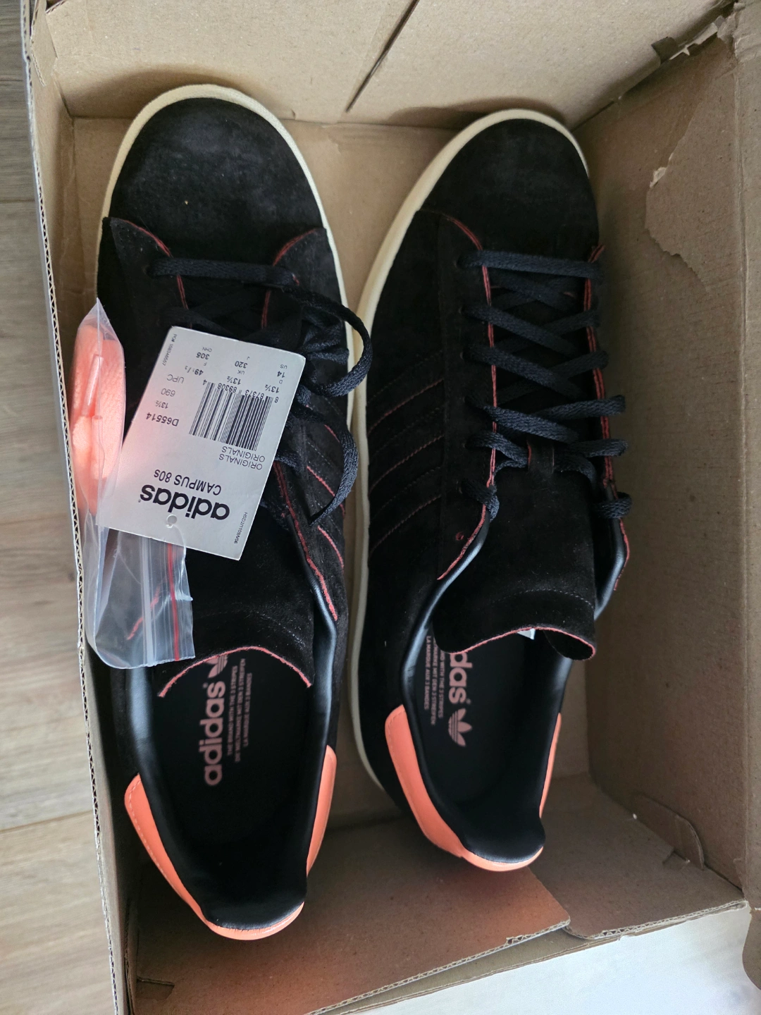 Men's Adidas Campus 80s sneakers. Black suede with orange accents. Size 14 US. New in box. Extra laces included.