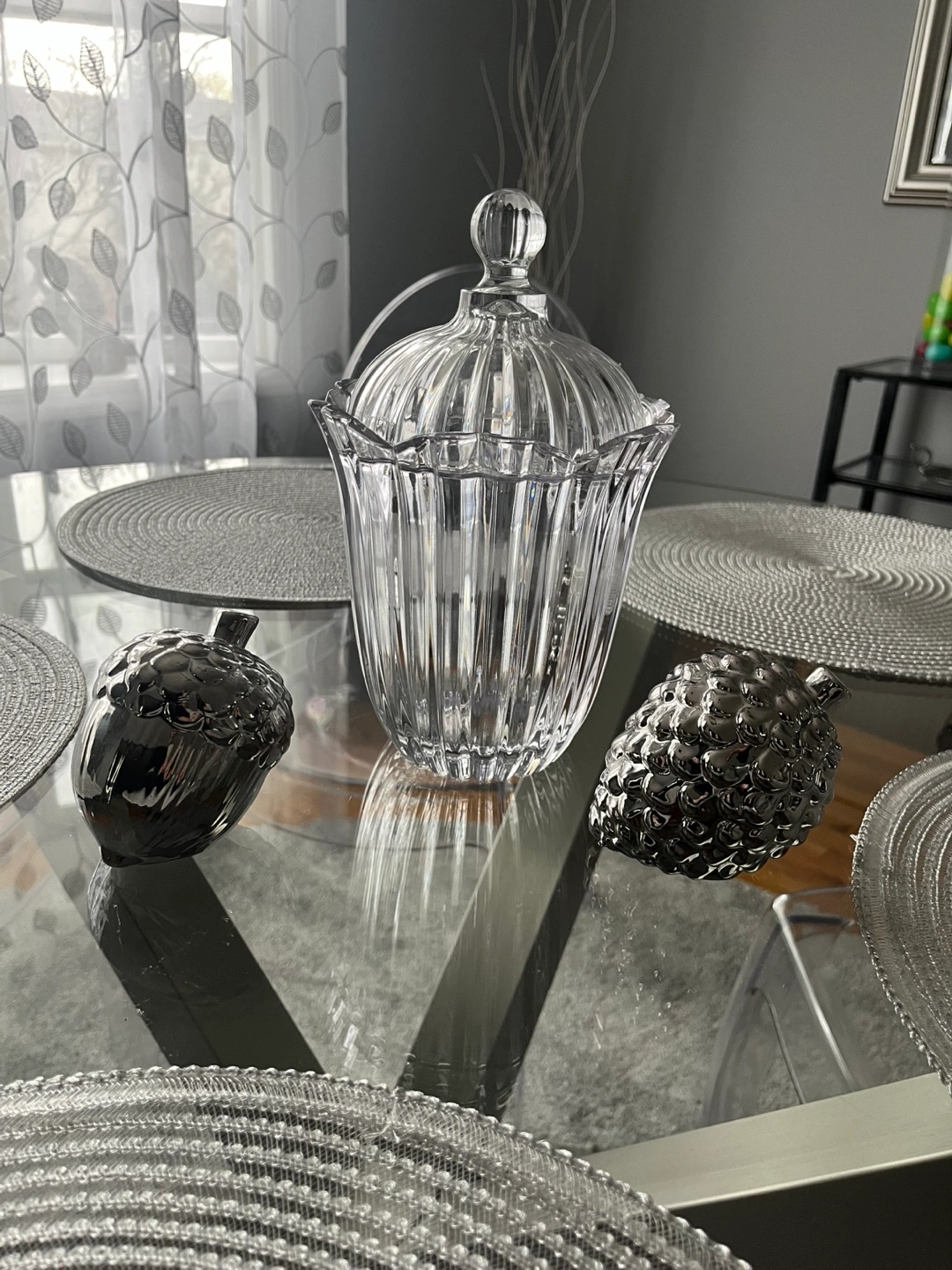 15Elegant crystal canister, ribbed design, domed lid. Perfect for a centerpiece or serving sweets.