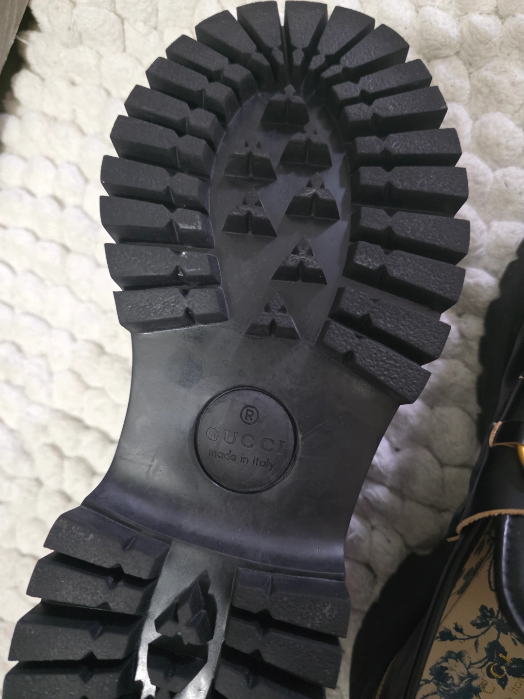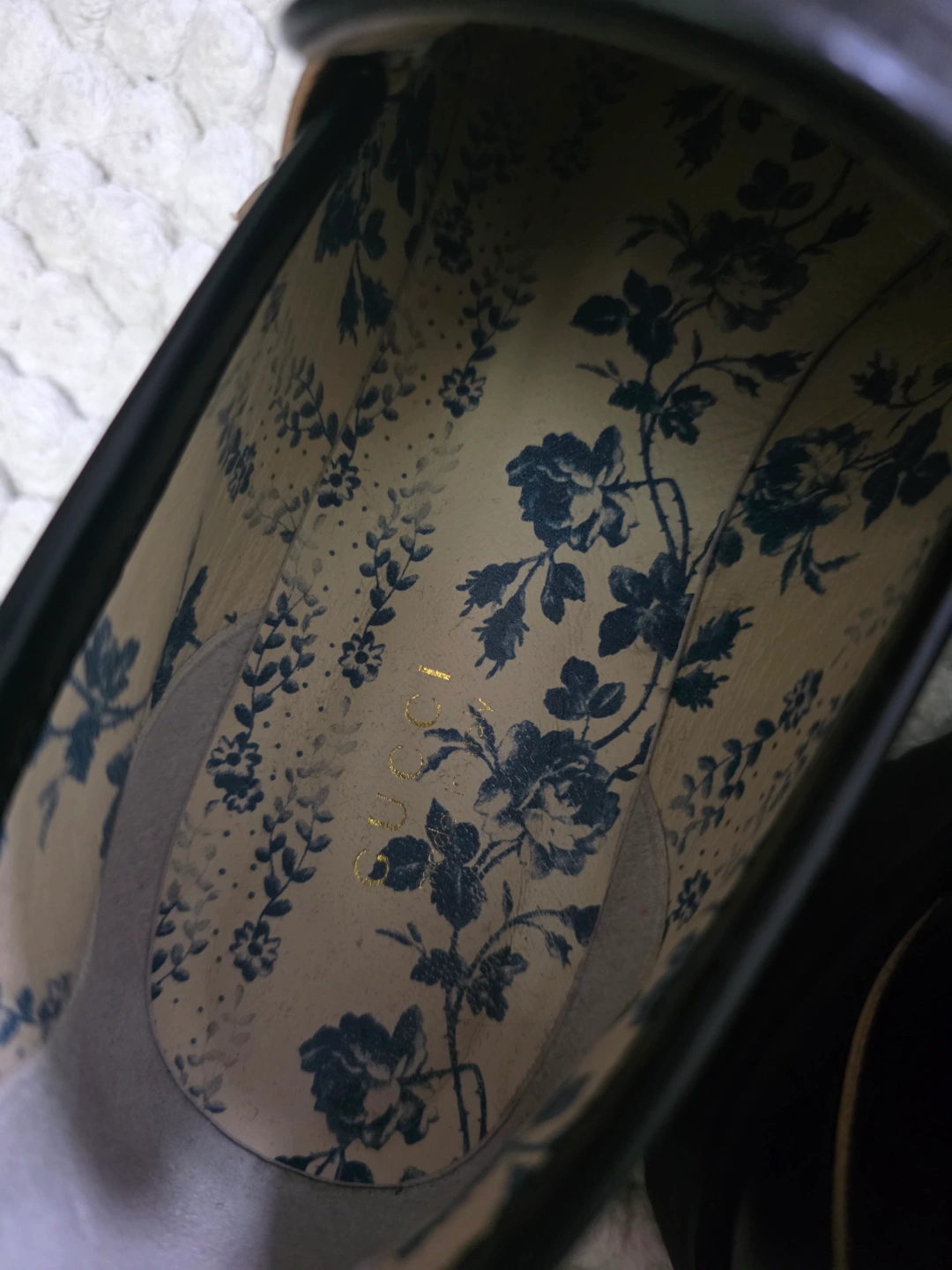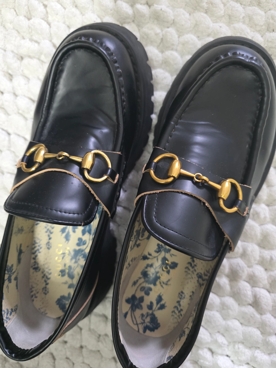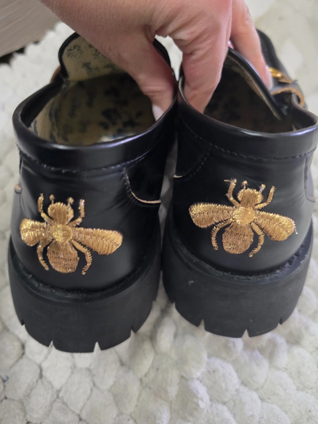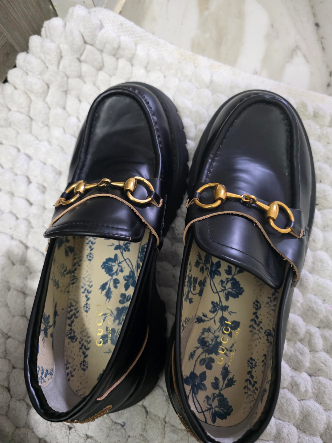 Women's black leather loafers. Gold horsebit detail. Bee embroidery. Floral insole. Thick rubber sole. Made in Italy.