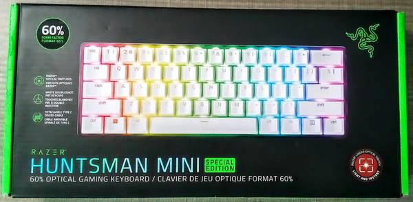 Razer Huntsman Mini Special Edition, 60% Optical Gaming Keyboard is Brand New Product details: Dominate on a different scale with the Razer Huntsman Mini a 60% gaming keyboard with cutting-edge Razer Optical Switches. Highly portable and ideal for streamlined setups, it’s time to experience lightning-fast actuation in our most compact form factor yet. The Razer Huntsman Mini doesn’t have the function row, home cluster, and Numpad of a traditional full-sized keyboard yet loses no functionality because all these inputs are still accessible via secondary functions and shortcuts. *Razer Optical Switches for actuation at the speed of light Offers faster, lighter, and smoother actuation than mechanical switches, and lasts longer as it requires fewer moving parts that operate with less friction. Comes in two variants—Linear and Clicky *Double shot PBT Keycaps with side-printed secondary functions for a premium, textured quality Designed for greater durability, they’ll never degrade to a shiny finish or have their labeling wear off with intense use. Side-printed secondary functions included for easier reference *Onboard memory and lighting presets to take your settings anywhere Store and activate up to 5 keyboard profiles without the need for software, as you personalize it further with a suite of Razer Chroma RGB lighting effects already loaded into the keyboard *60% form factor for a portable, streamlined gaming experience Ideal for minimalist or smaller setups where desk space is a premium. Its compact build also means it travels well and is easier to position when gaming—allowing you to play more comfortably *Detachable Type-C cable for easier setup and storage Unpack, plug and play with minimal fuss for all your LAN parties and tournaments. A cable latch ensures that it stays securely connected during gameplay *Aluminum construction for greater durability The casing is robust enough to withstand long hours of intense, regular use and has a clean matte finishing