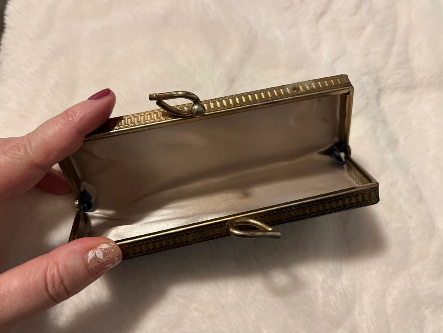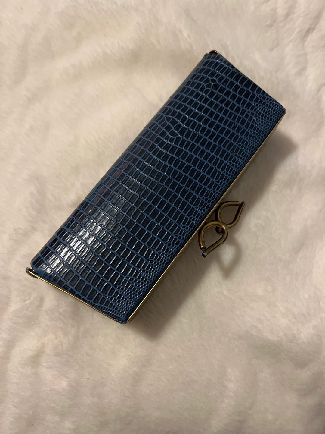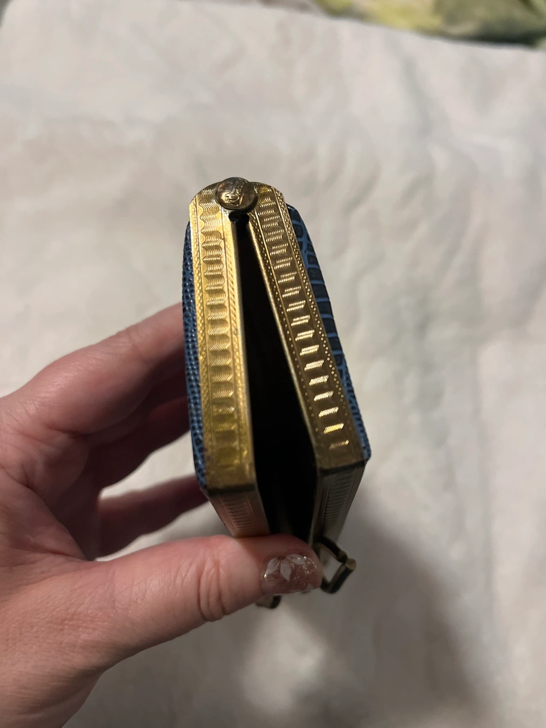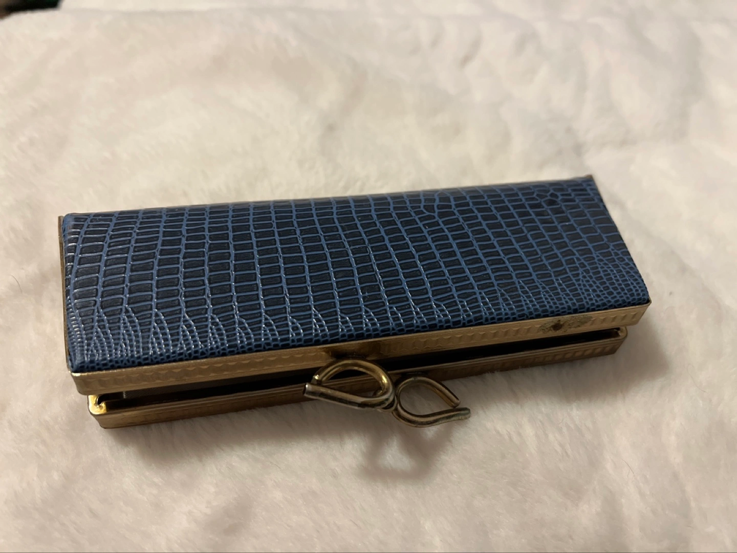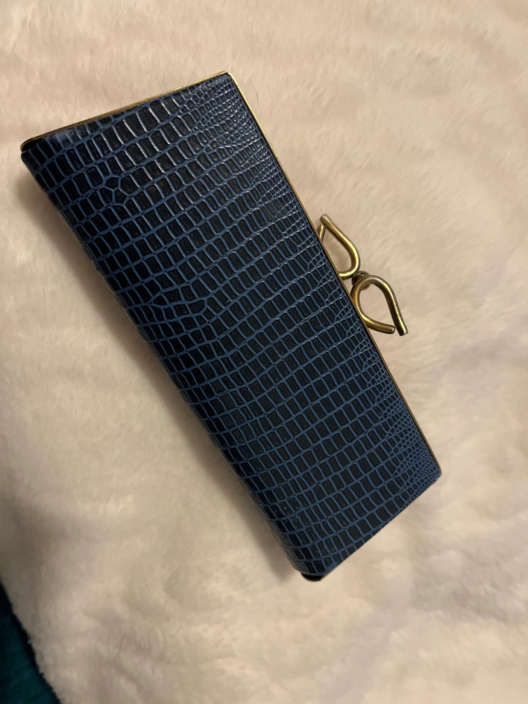 240Features a gold metal frame and clasp. Crocodile-embossed texture. Will fit a small pair of glasses. Or, can be used decoratively.