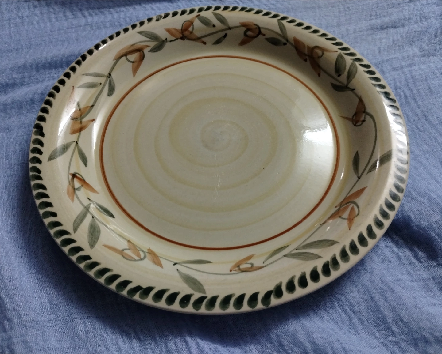 121Cream-colored plate. Features a decorative floral pattern. Like new, some where from sitting in my storage room.