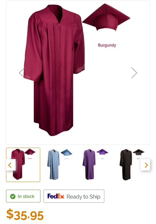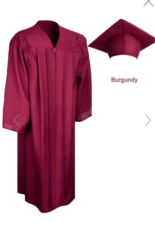Burgundy graduation gown and cap. Ready to ship. Zipper closure. Long sleeves.