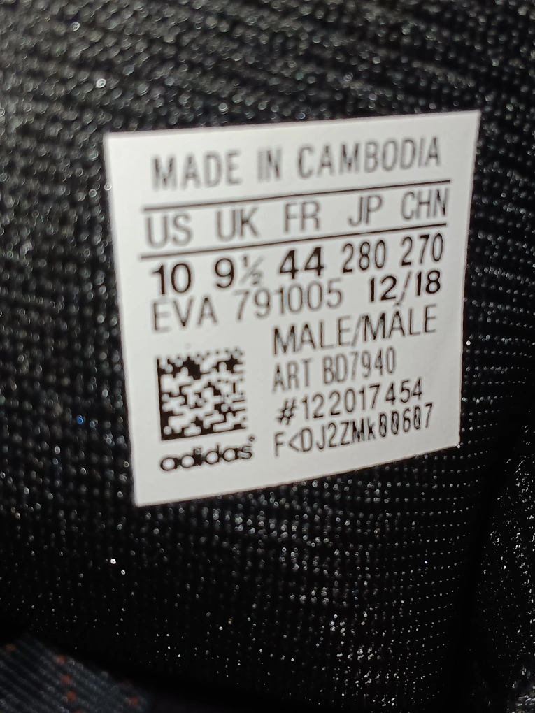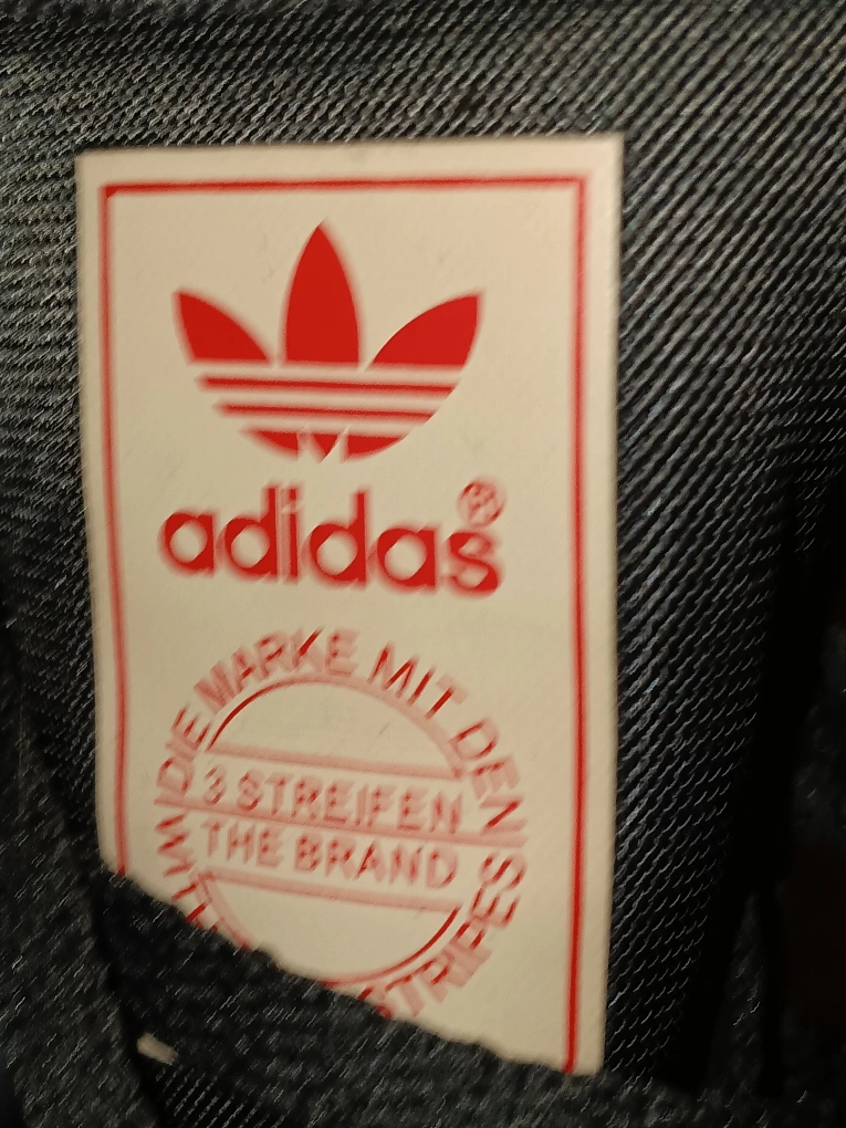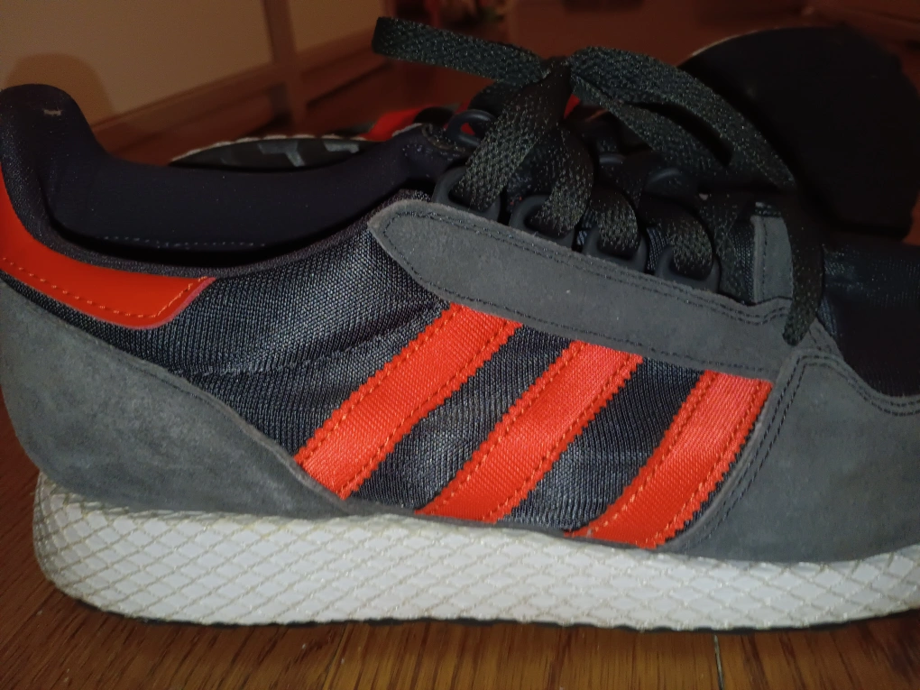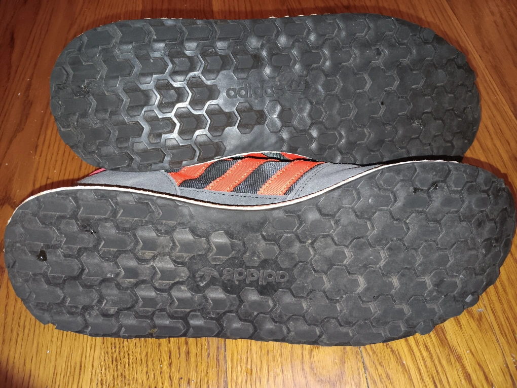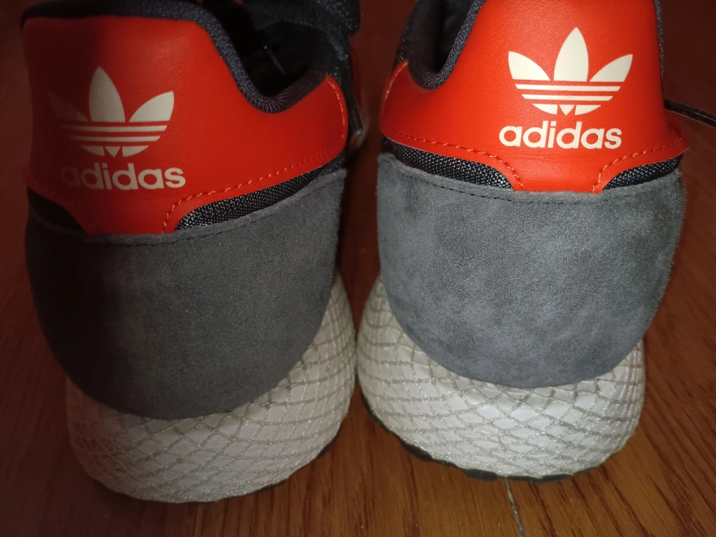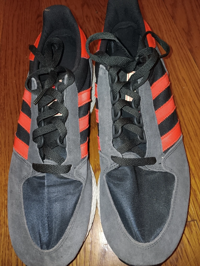 Pair of Adidas sneakers. Gray and red. Suede and mesh upper. Vintage style. Hexagonal sole pattern. Black laces.