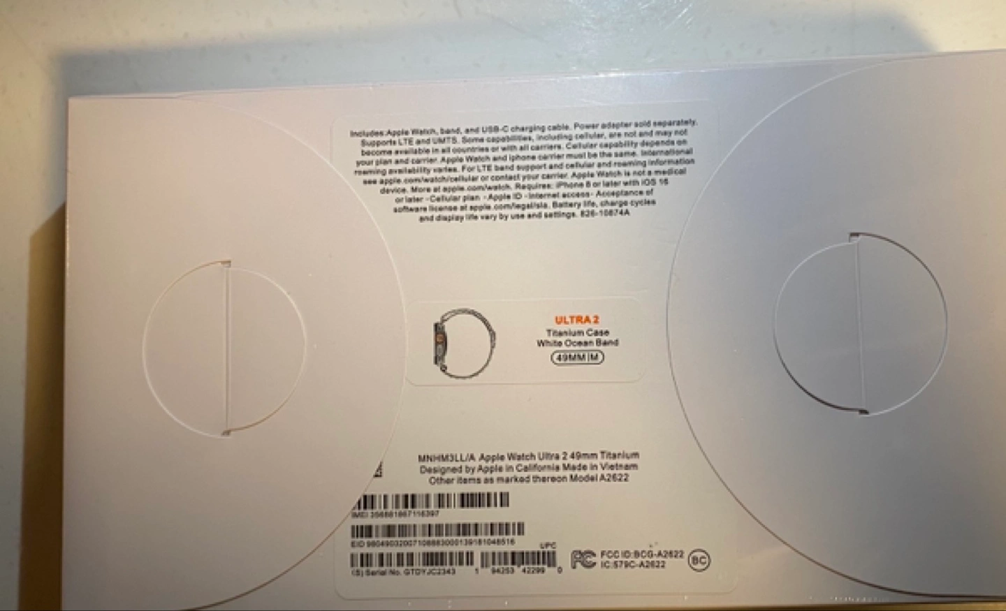 115Brand new Apple Watch Ultra in titanium case with white ocean band. 49mm size. Includes watch, band, and USB-C charging cable.