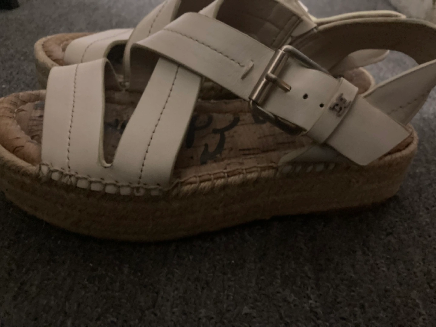 White leather platform sandals. Cross straps and ankle buckle closure. Cork wedge sole. Size 6 Pick up and by cash 💚🥕