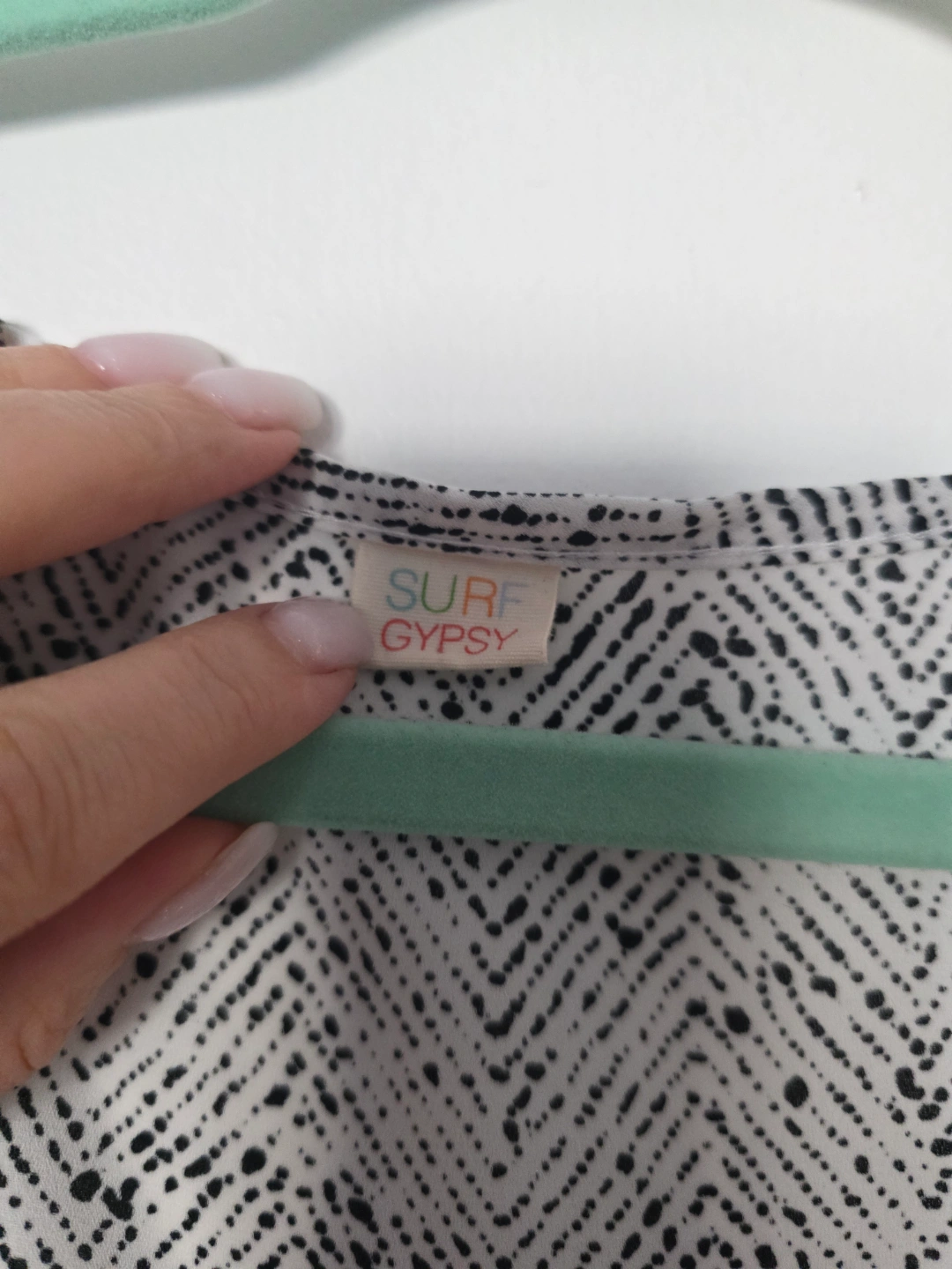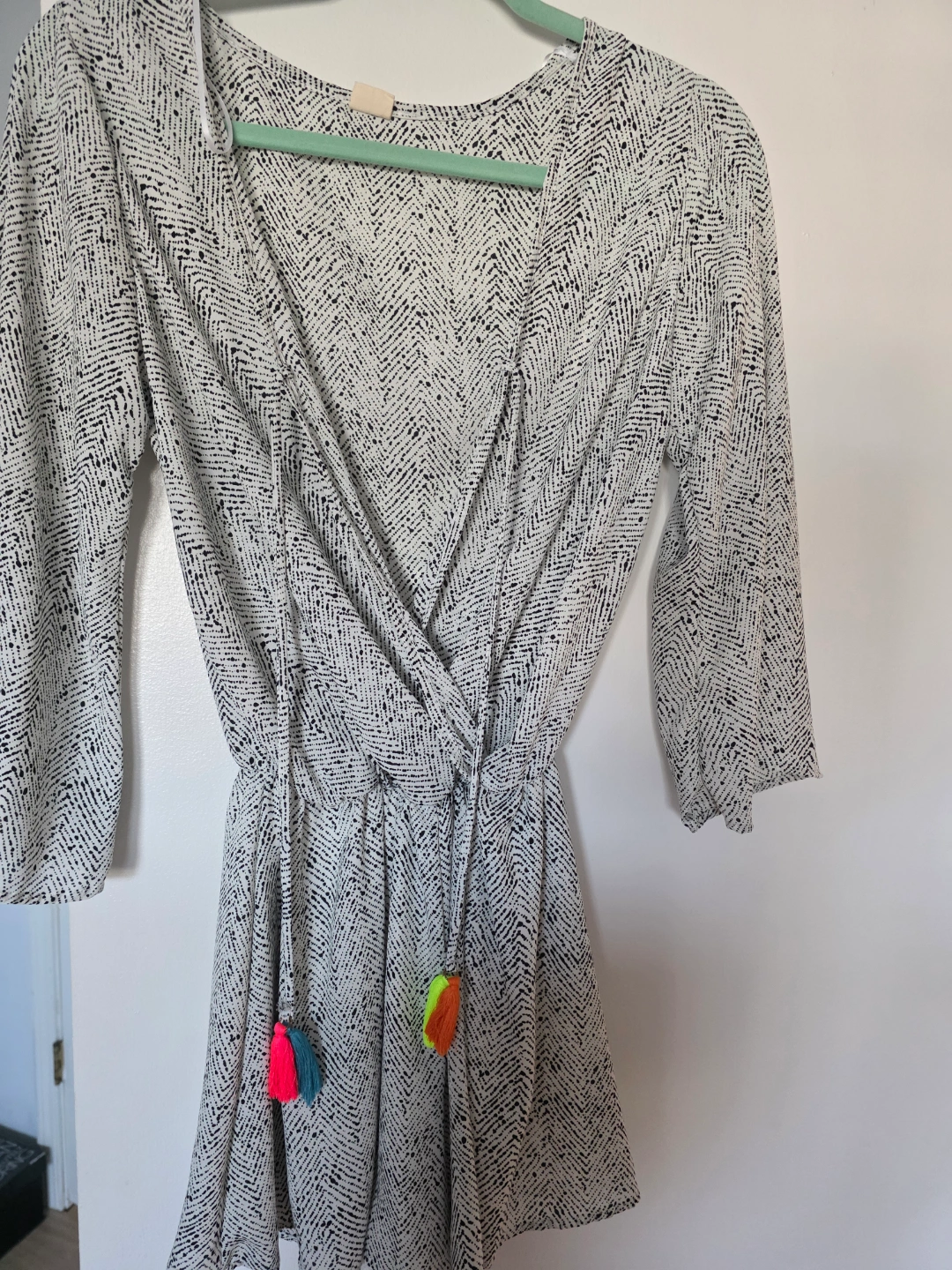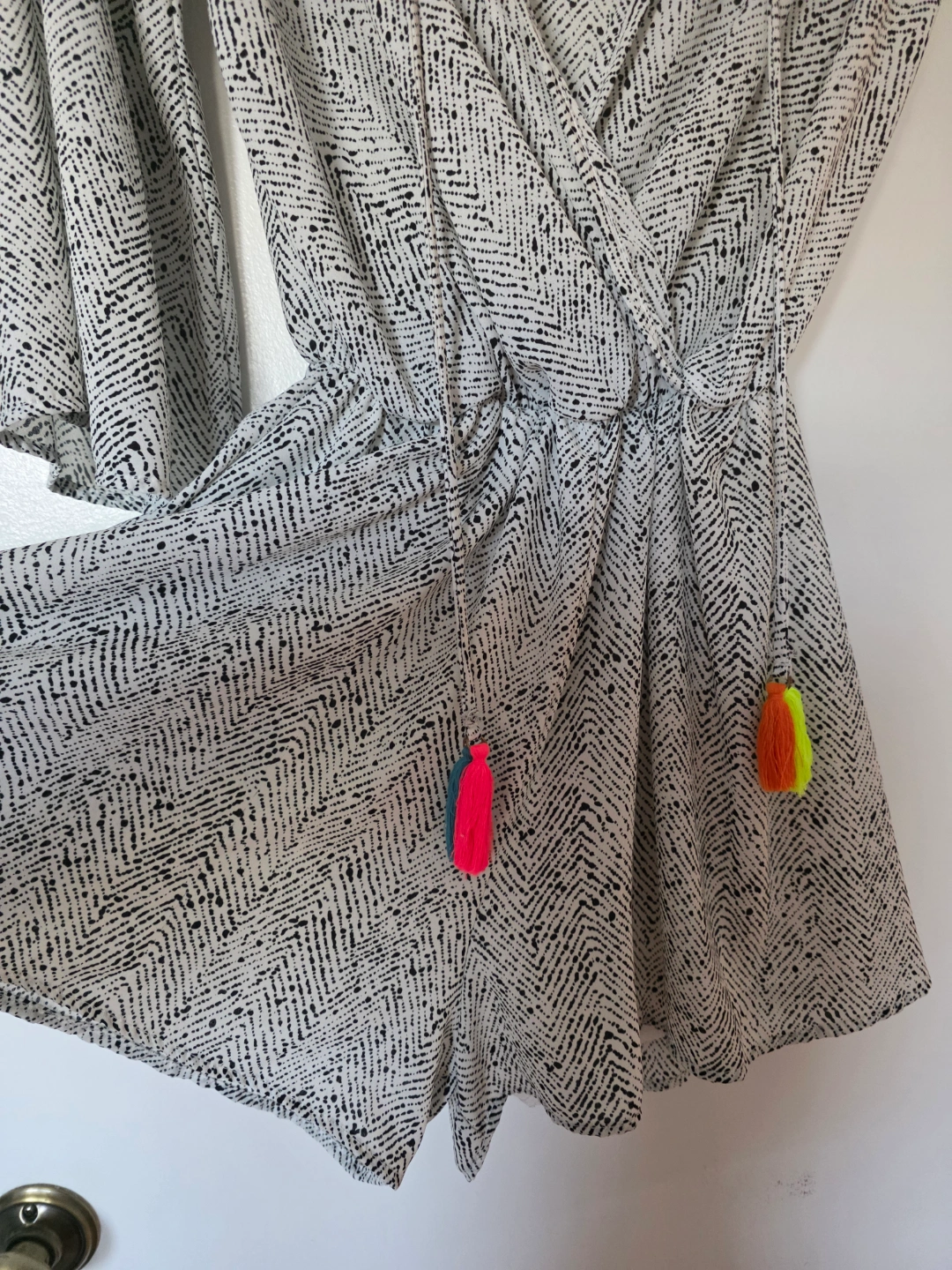 Adorable romper, black and white chevron print. Three-quarter sleeves. Drawstring waist. Colorful tassels at the hem. Lightweight fabric.