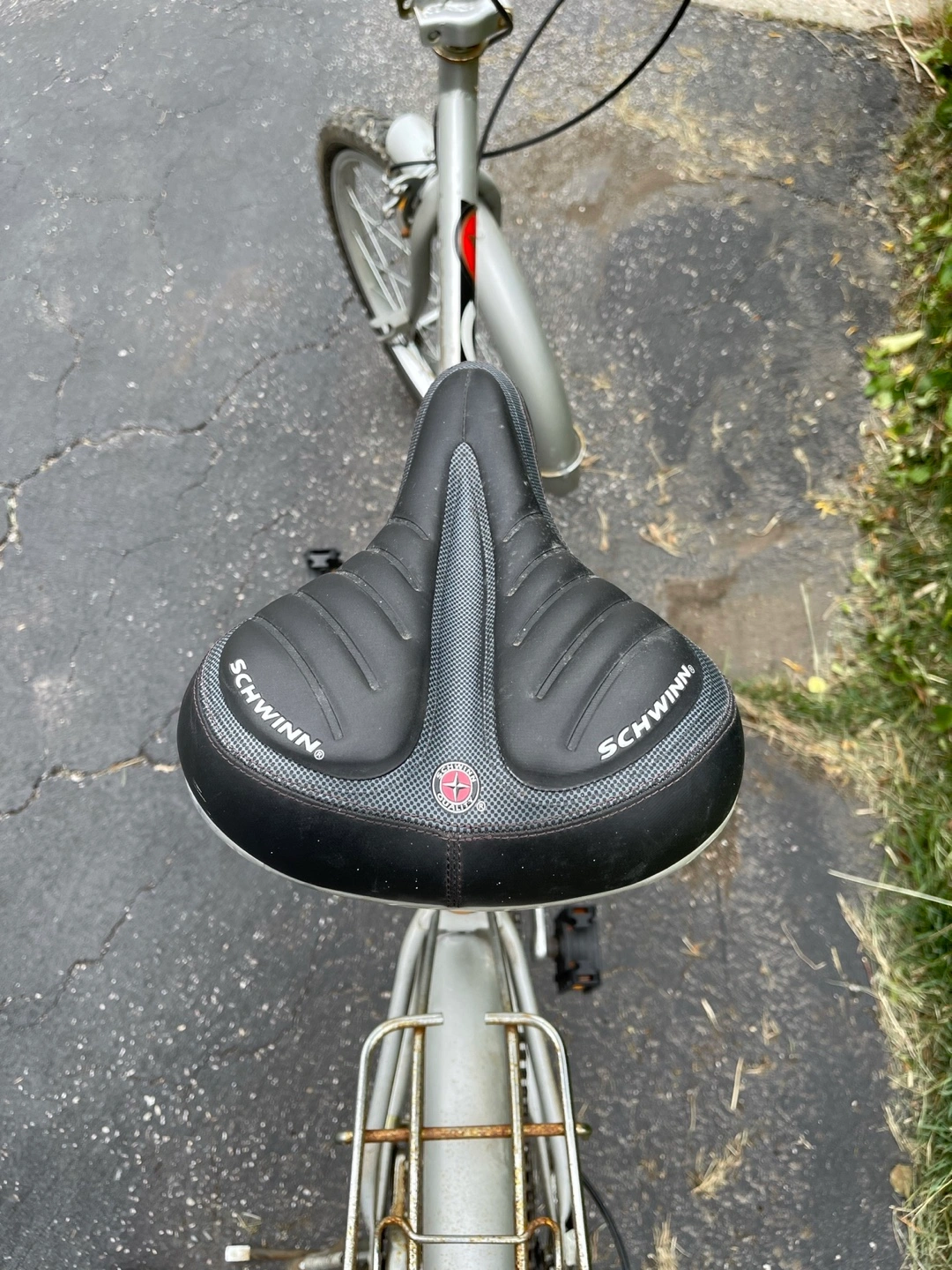 Silver folding bike. Needs some TLC and some air or tubes in the tires. I didn’t have time to mess around with it. Features a rear rack and Schwinn seat. Shows wear from use.