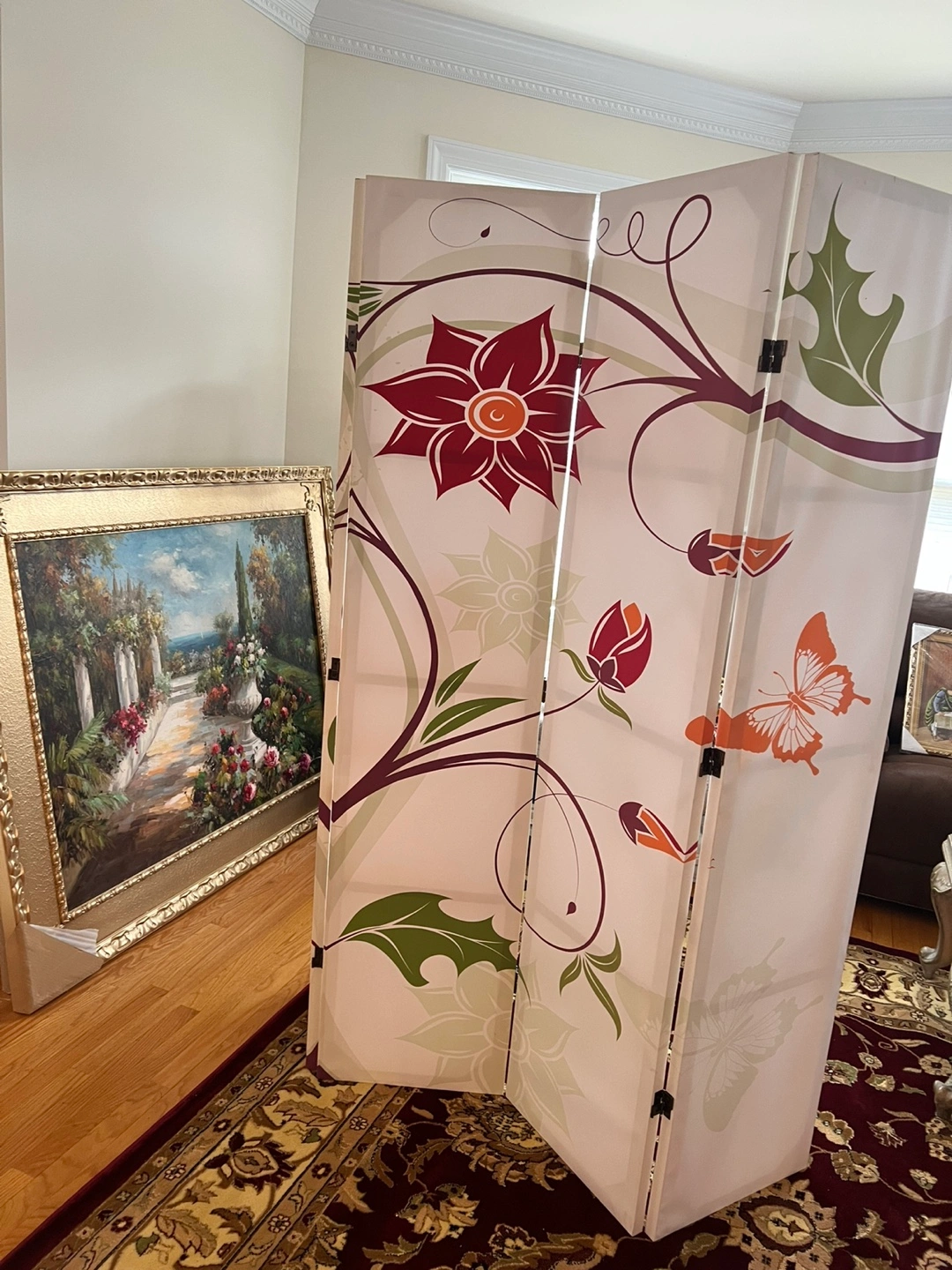 Three panel room divider. Floral print. Butterflies and flowers. Beige background.