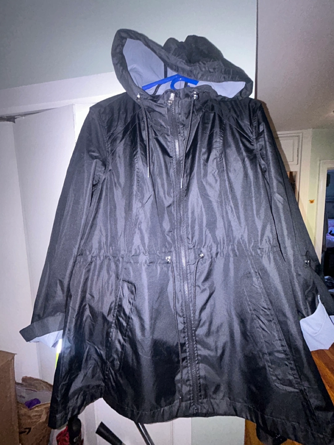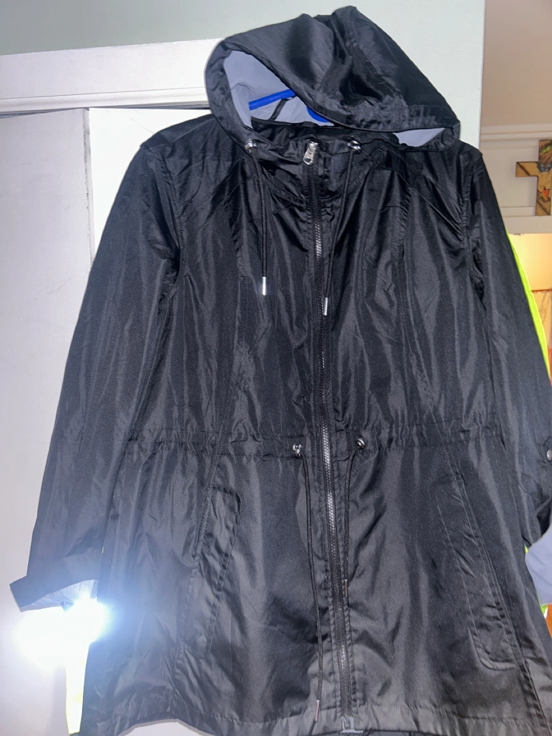 234Lightweight black jacket. Features a hood, zipper closure, and pockets. Great for layering. Size Large.