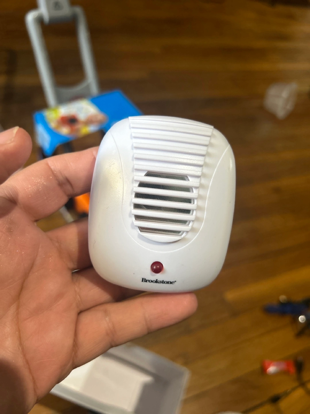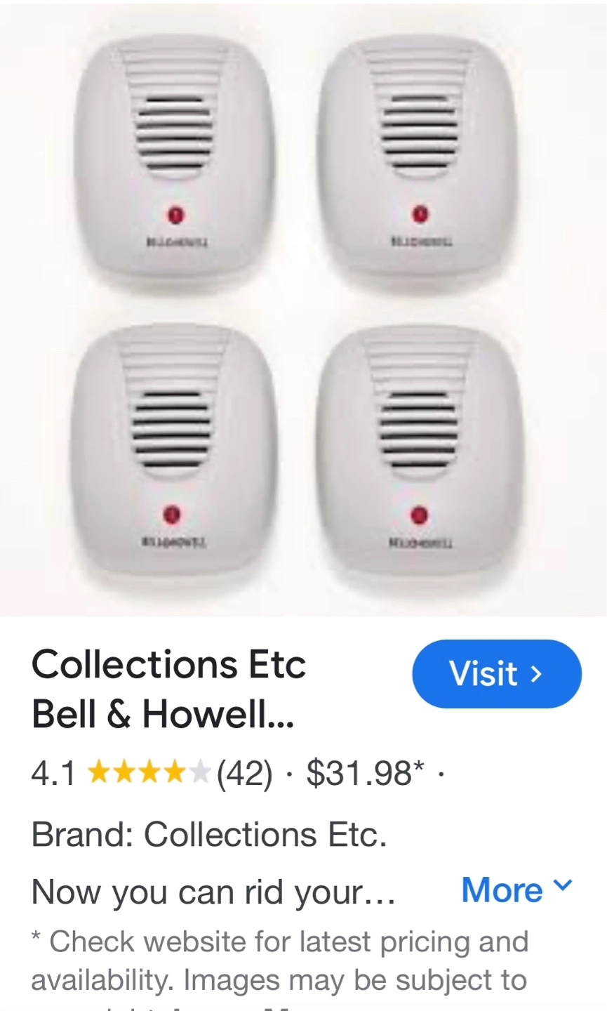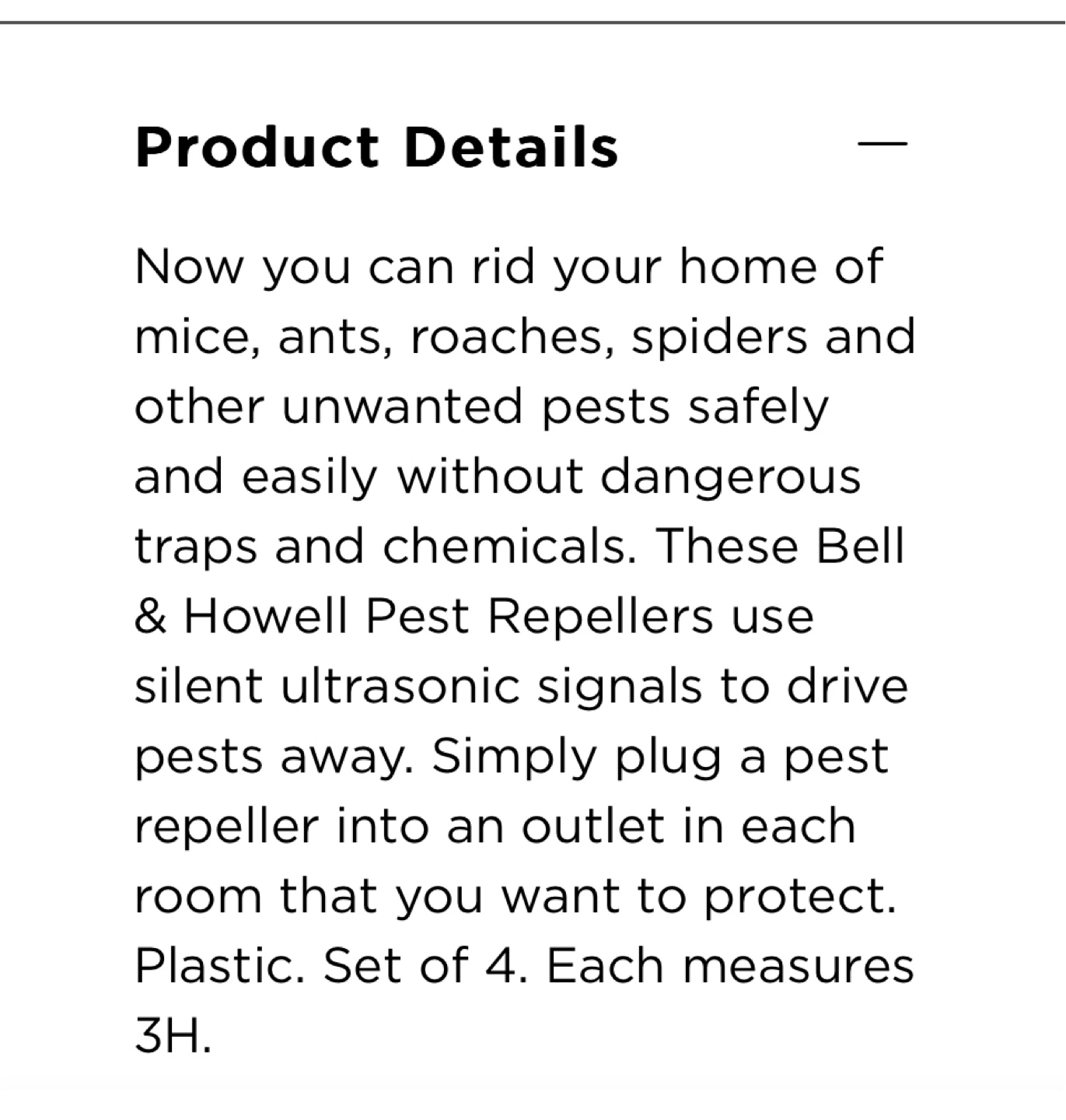 226Set of four Brookstone pest repellers. Ultrasonic pest control. Silent operation. Plug-in design. Easy to use. Effective against mice, ants, roaches, and spiders.