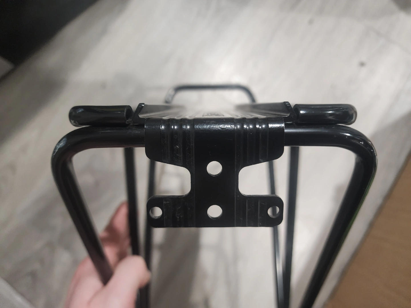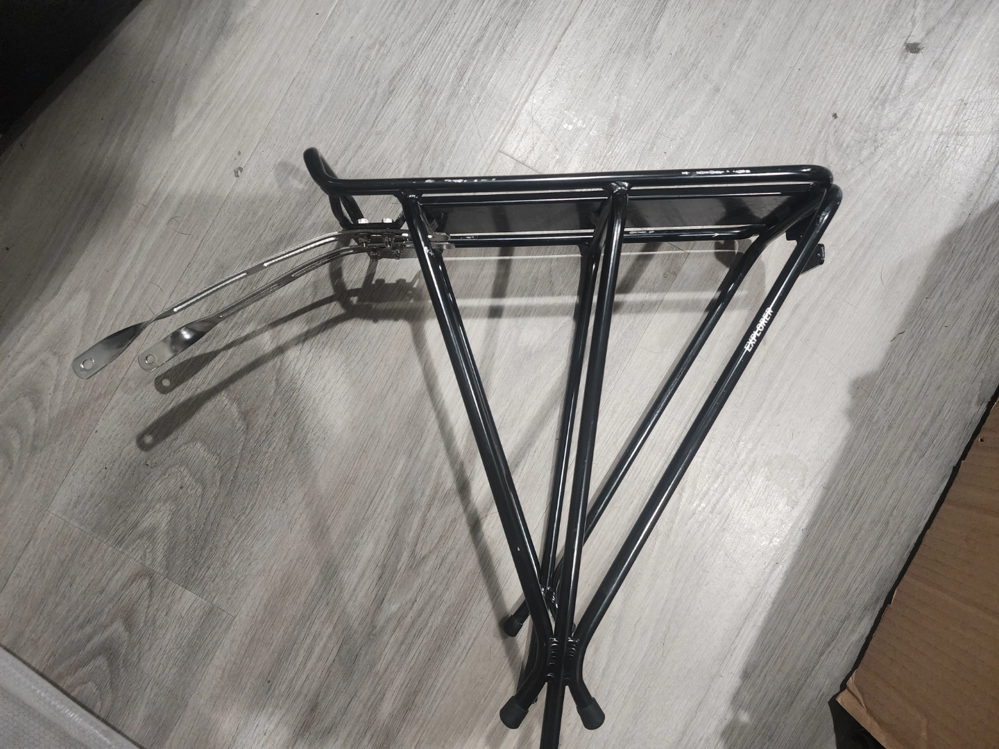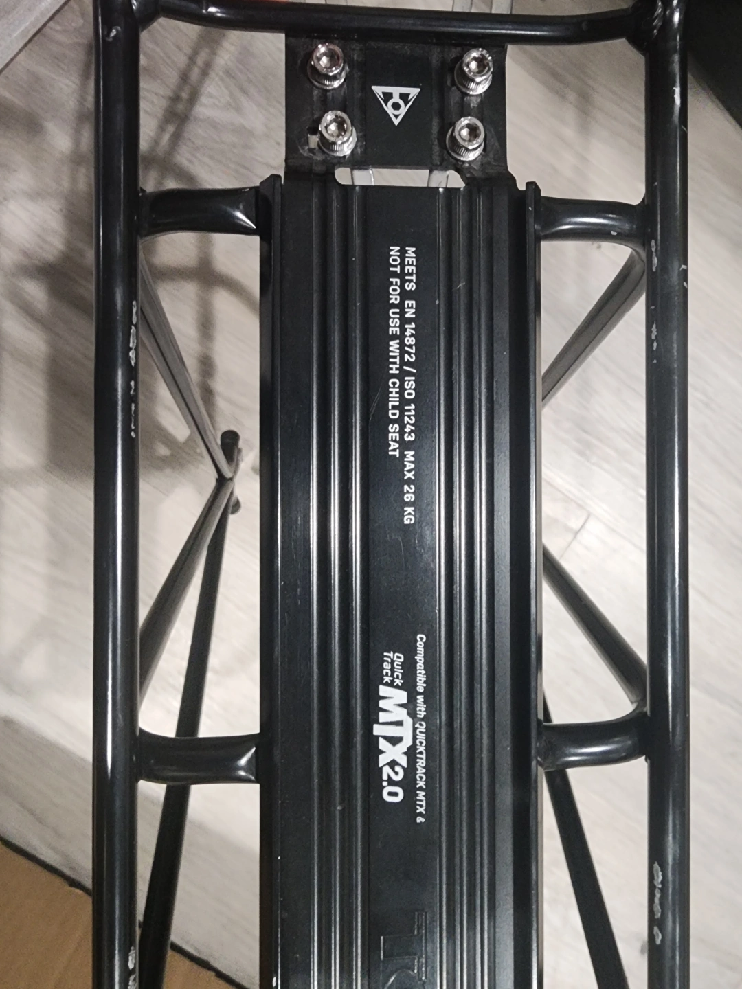 Used bicycle rack. Black metal construction. Compatible with Quickrack MTX. Max weight 28 kg. Not for use with child seat.