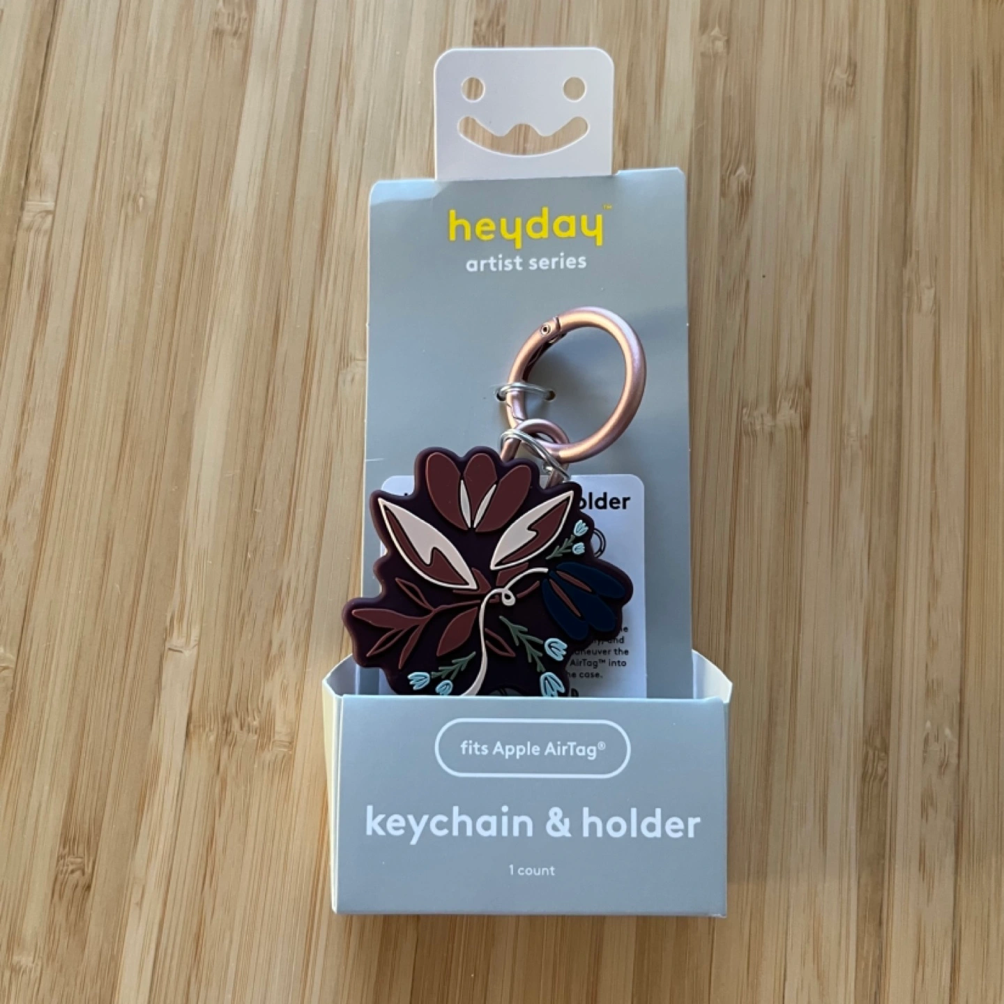 New keychain and holder. Fits Apple AirTag. Rose gold keychain. Dark floral design.