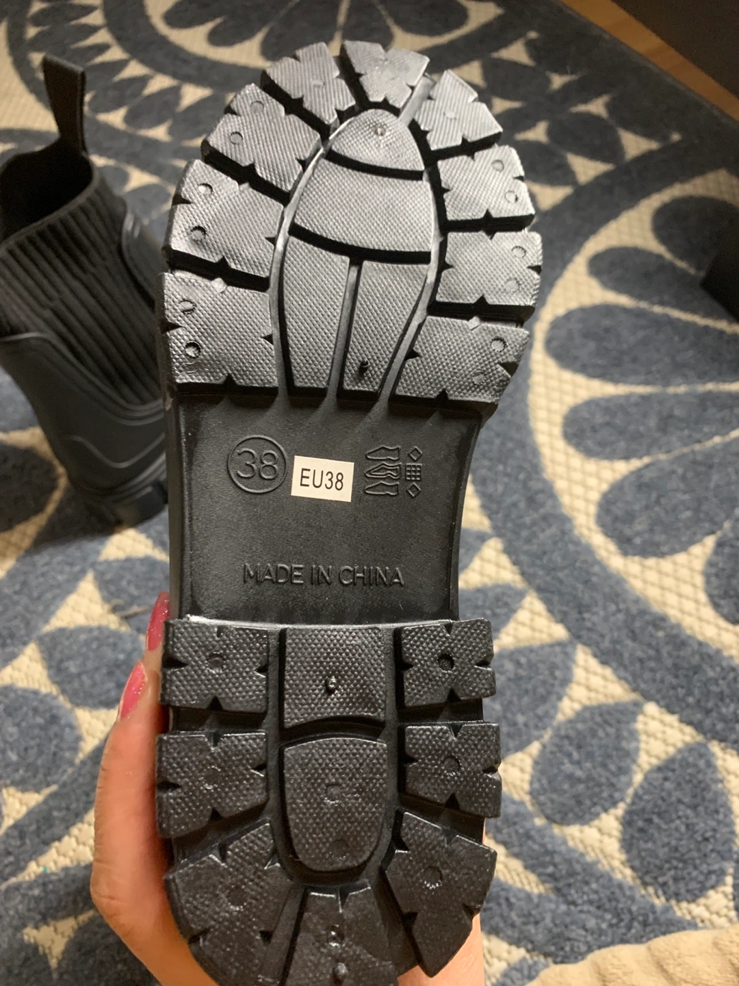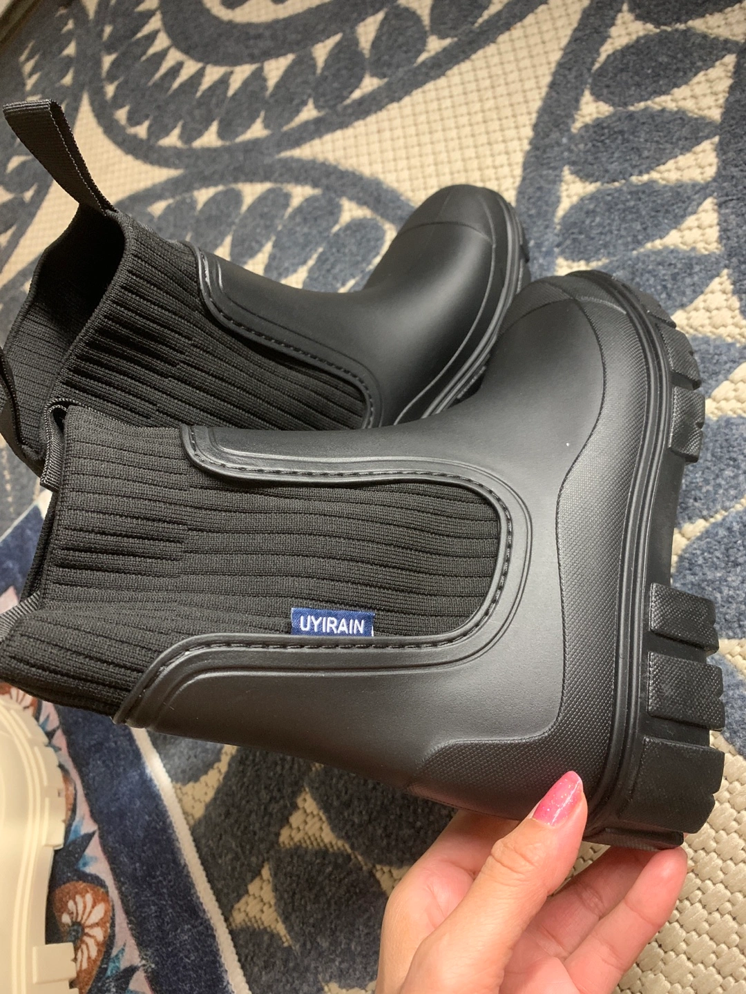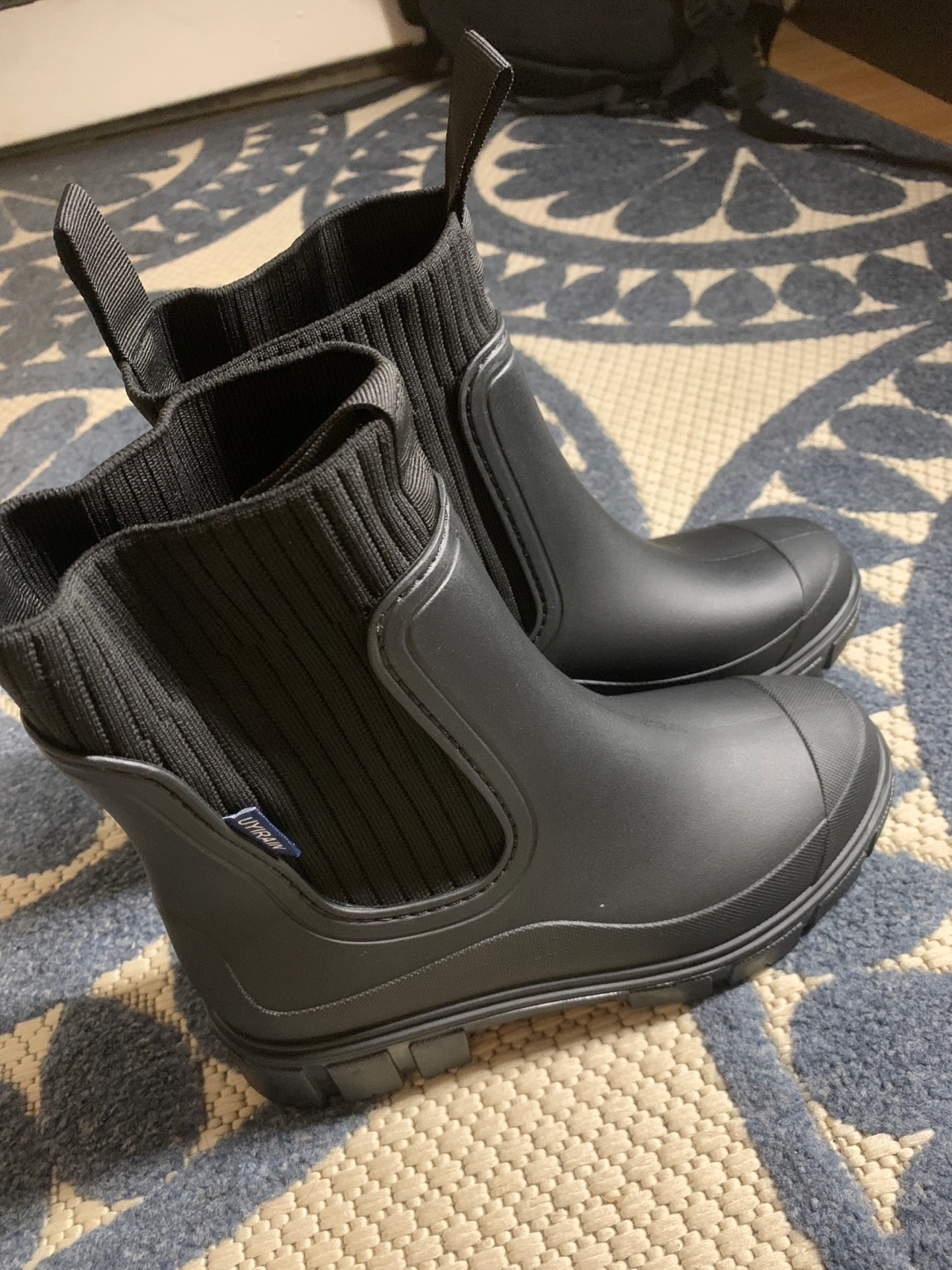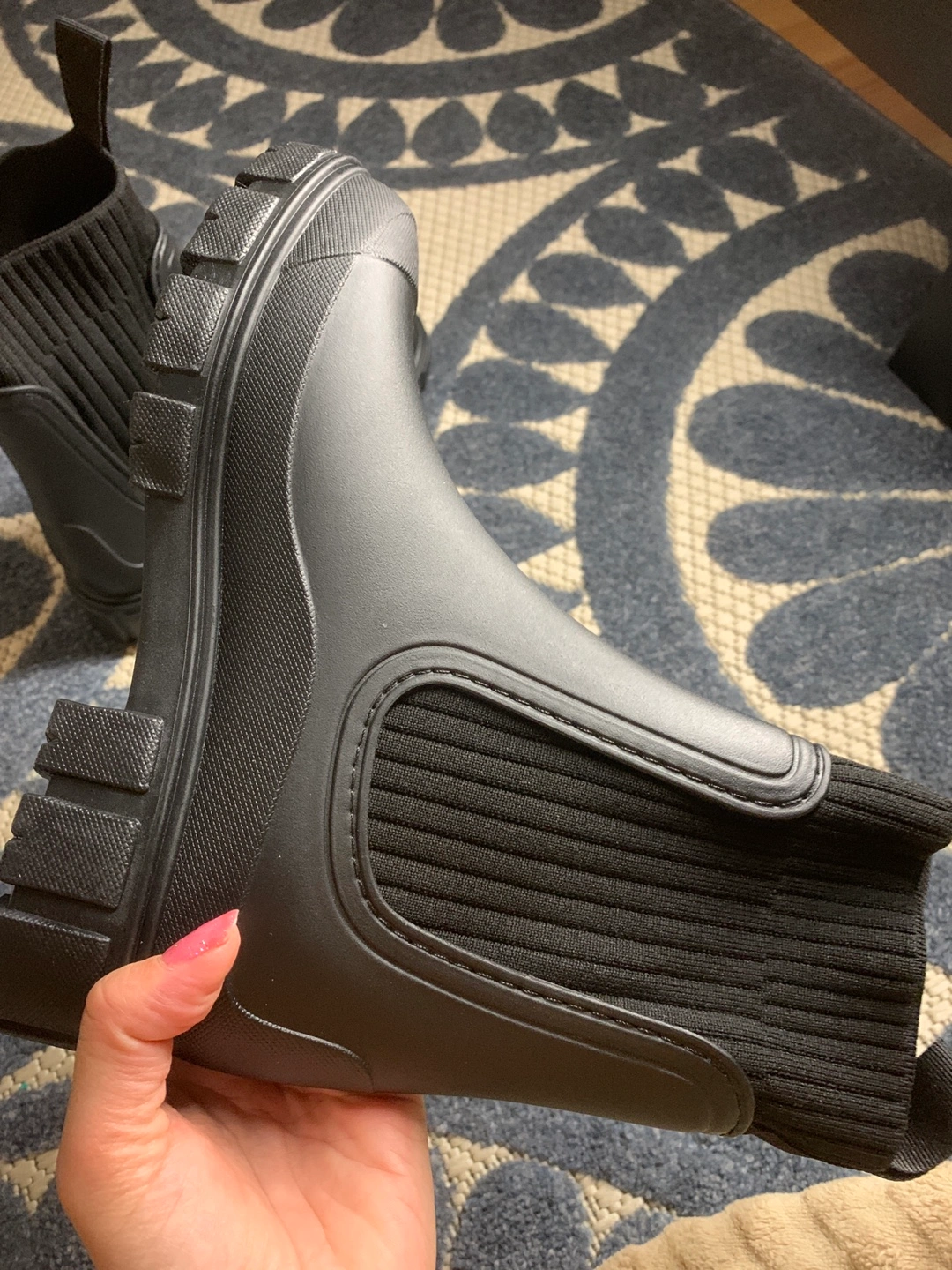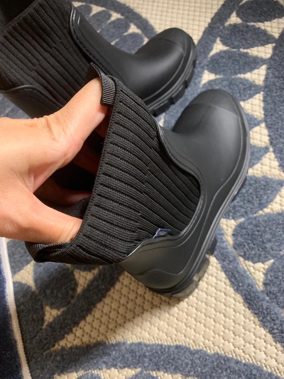 Women's black rain boots. Knit fabric shaft. Chunky lug sole. Size EU38. Made in China.