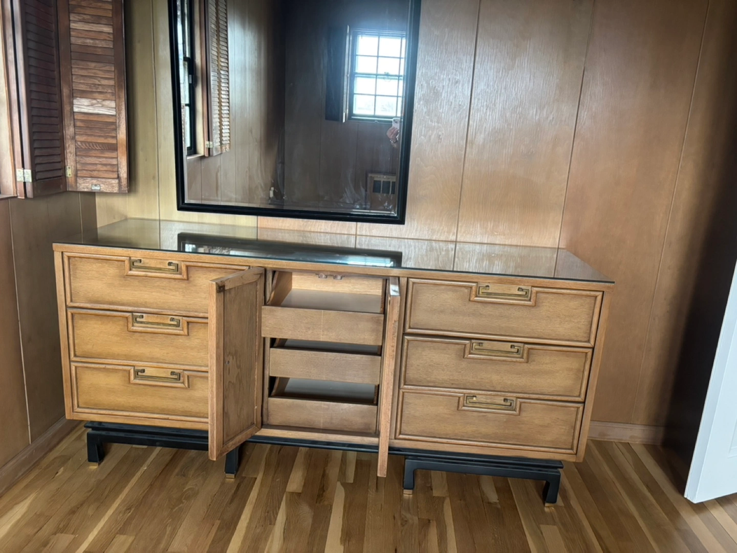 10Gorgeous mid century modern dresser. Six drawers, two cabinets three extra drawers inside. Custom Glass to for extra protection . Black metal legs. Great vintage piece. Mirror sold separately. Garden city area