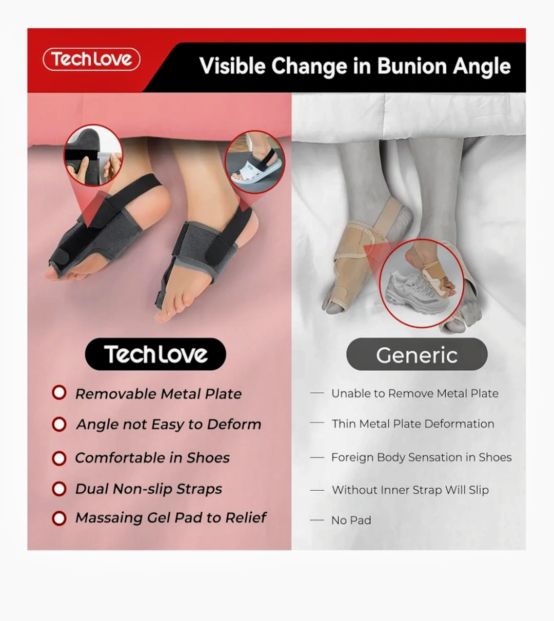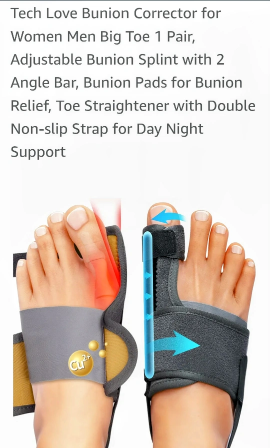237Bunion relief and correction. Adjustable bunion splint with two angle bars. Features bunion pads, toe straightener, and double non-slip straps. Provides day and night support. Washable antimicrobial material. Removable heel strap.
